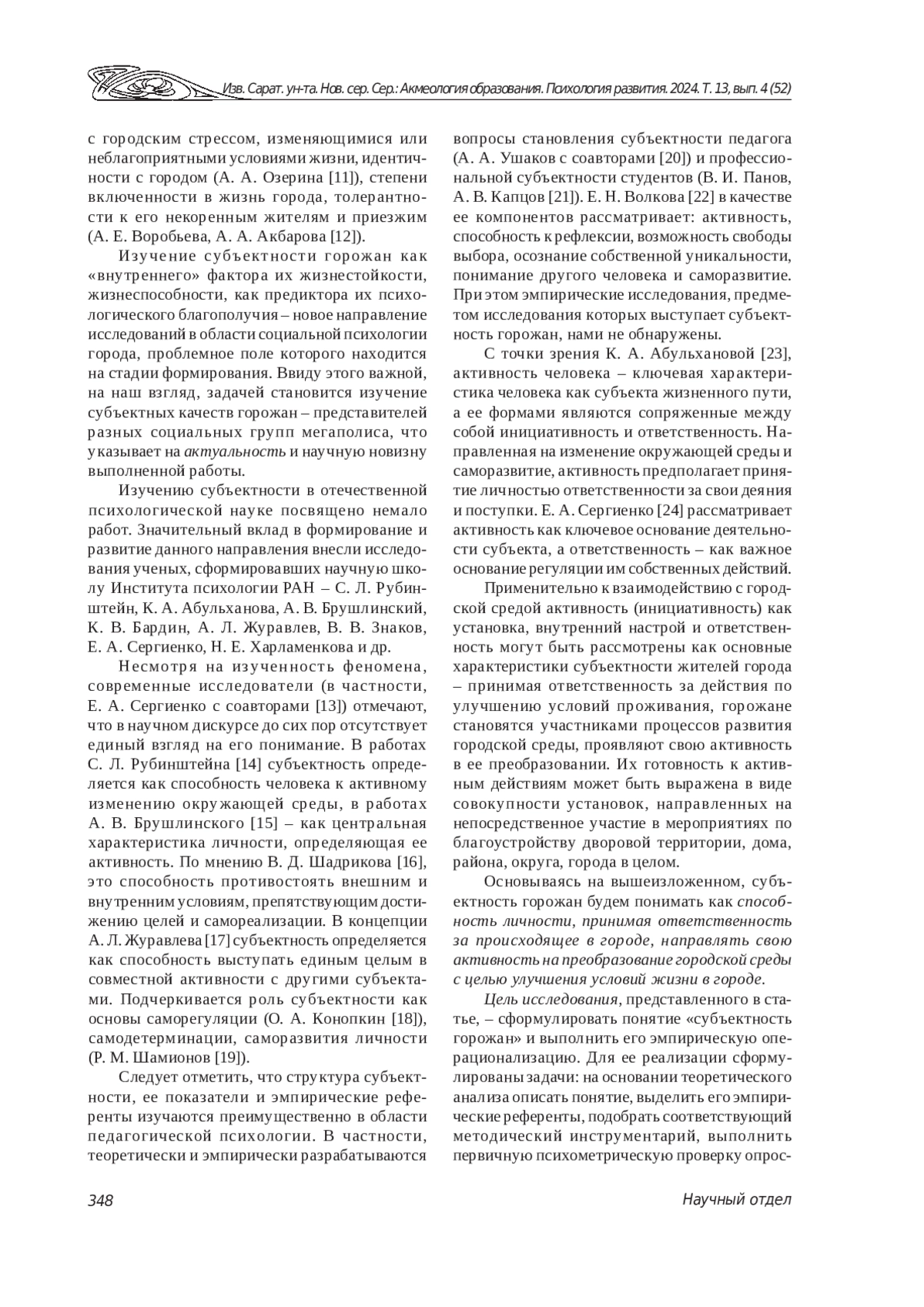 23. Абульханова К. А. Принцип субъекта в отечественной психологии // Психология. Журнал Высшей школы экономики. 2005. Т. 2, № 4. С. 3-21. EDN: JWMBCD