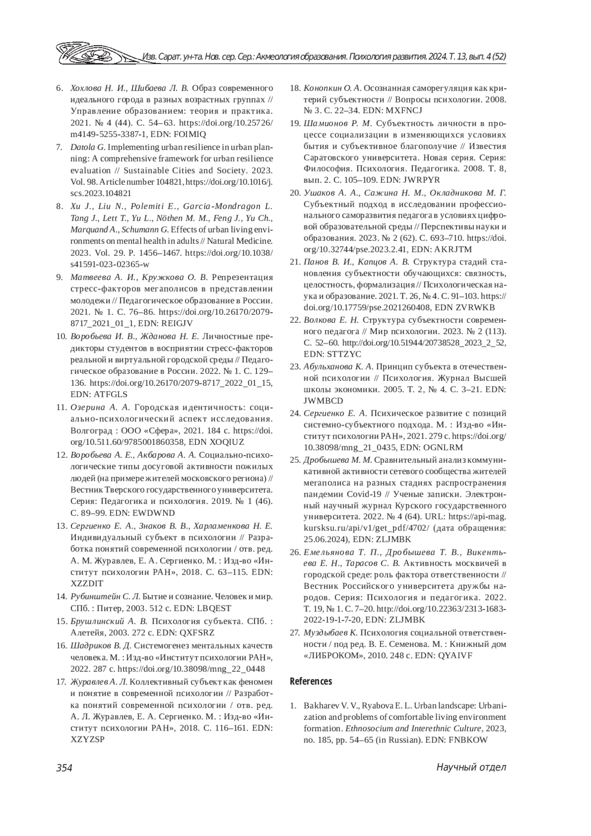 5. Дробышева Т. В., Емельянова Т. П. Жизнеспособность горожан: содержание понятия, теоретические и эмпирические возможности его применения // Известия Саратовского университета. Новая серия. Серия: Акмеология образования. Психология развития. 2020. Т. 9, вып. 3 (35). С. 232-240. ,. DOI: 10.18500/2304-9790-2020-9-3-232-240 EDN: DJVGAL