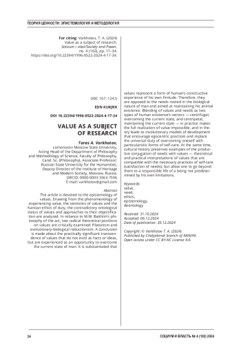 Статья посвящена эпистемологии ценностей. Отталкиваясь от феноменологии переживания ценности, семиотики ценностей и кантианской этики долга, анализируется противоречивый онтологический статус ценностей и подходы к их опредмечиванию. С опорой на философию поступка М. М. Бахтина критически рассматриваются две радикальные теоретические позиции в отношении ценностей: платонизм и эволюционно-биологический редукционизм. Делается вывод о практически значимой трансцендентности ценностей, не существующих в качестве фактов или идей, но переживаемых в качестве возможности преодоления наличного состояния человека. Обосновывается, что ценности представляют собой форму конструктивного переживания человеком собственной конечности. Поэтому они противоположны потребностям, укорененным в биологической природе человека и направленным на поддержание его животного существования. Смешение ценностей и потребностей как двух типов векторов человеческого существования - центробежного, преодолевающего наличное состояние, и центростремительного, удерживающего наличное состояние, - в практике делает невозможным полную реализацию ценности, а в теории приводит к инволюционным моделям развития, поощряющим эгоцентрические практики и подменяющим частными формами заботы о себе всеобщий долг преодоления себя. При этом культурная история хранит образцы продуктивного сопряжения потребностей с ценностями, - теоретические и практические интерпретации ценностей, совместимые с необходимыми практиками заботы о себе (удовлетворением потребностей), но позволяющие выйти за их пределы к ответственной жизни не предопределенного собственной ограниченностью существа.