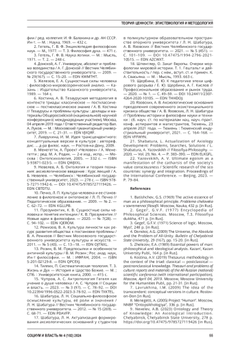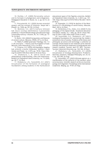 17. Шабатура, Л. Н. Актуализация формирования аксиологических оснований у студентов в поликультурном образовательном пространстве опорного университета / Л. Н. Шабатура, А. В. Язовских // Вестник Челябинского государственного университета. - 2021. - № 5 (451). - С. 101-109. DOI: 10.47475/1994-2796-202110515 EDN: AZCWXT
