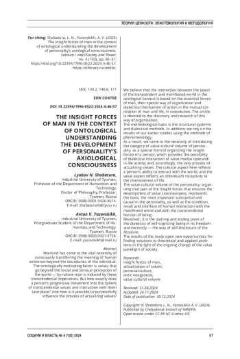 22. Yazovskikh, A. V. Ultimate egoism as a manifestation of the catharsis of the society’s value consciousness / Scientific research of the sco countries: synergy and integration. Proceedings of the International Conference. - Beijing, 2023. - Р. 79-84. EDN: BXLRMQ