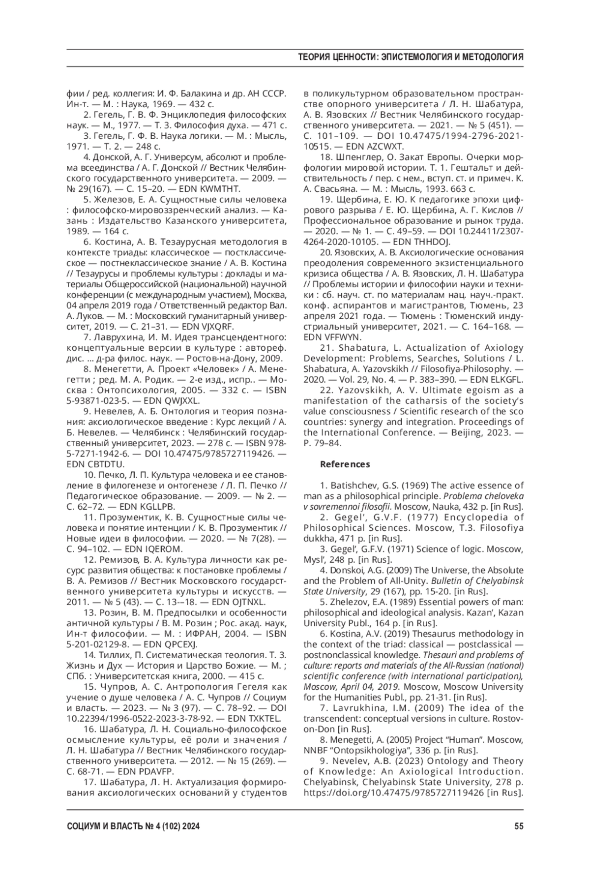 21. Shabatura, L. Actualization of Axiology Development: Problems, Searches, Solutions / L. Shabatura, A. Yazovskikh // Filosofiya-Philosophy. - 2020. - Vol. 29, No. 4. - P. 383-390. EDN: ELKGFL