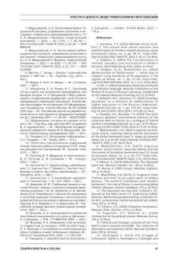 7. Медушевский, А. Н. Когнитивная война: социальный контроль, управление сознанием и инструмент глобального доминирования (часть 1) / А. Н. Медушевский // Вопросы теоретической экономики. - 2023. - № 2 (19). - С. 85-98. DOI: 10.52342/2587-7666VTE_2023_2_85_98 EDN: RBPICM