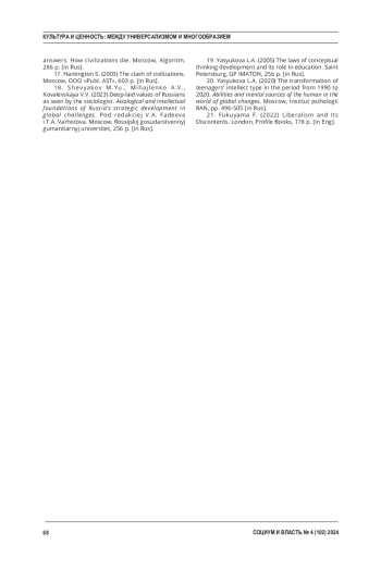 20. Ясюкова, Л. А. Изменение типа интеллекта подростков за период с 1990 по 2020 года / Л. А. Ясюкова // Способности и ментальные ресурсы человека в мире глобальных перемен. М.: Институт психологии РАН, 2020. - С. 496-505. 21. Fukuyama, F. Liberalism and Its Discontents / F. Fukuyama. - London: Profile Books. 2022. - 178 p.