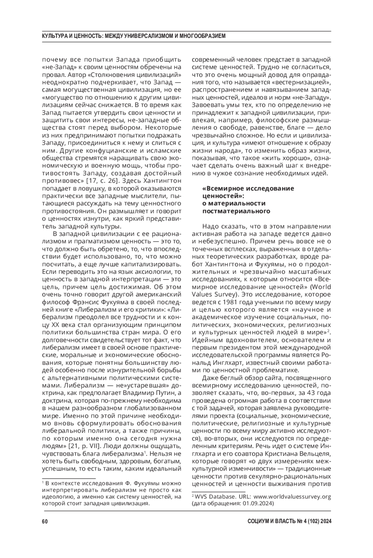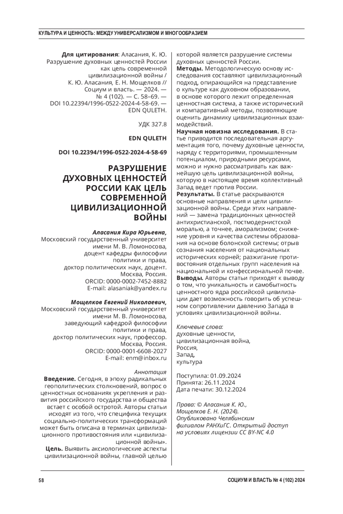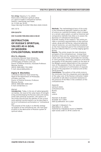 Введение. Сегодня, в эпоху радикальных геополитических столкновений, вопрос о ценностных основаниях укрепления и развития российского государства и общества встает с особой остротой. Авторы статьи исходят из того, что специфика текущих социально-политических трансформаций может быть описана в терминах цивилизационного противостояния или «цивилизационной войны».