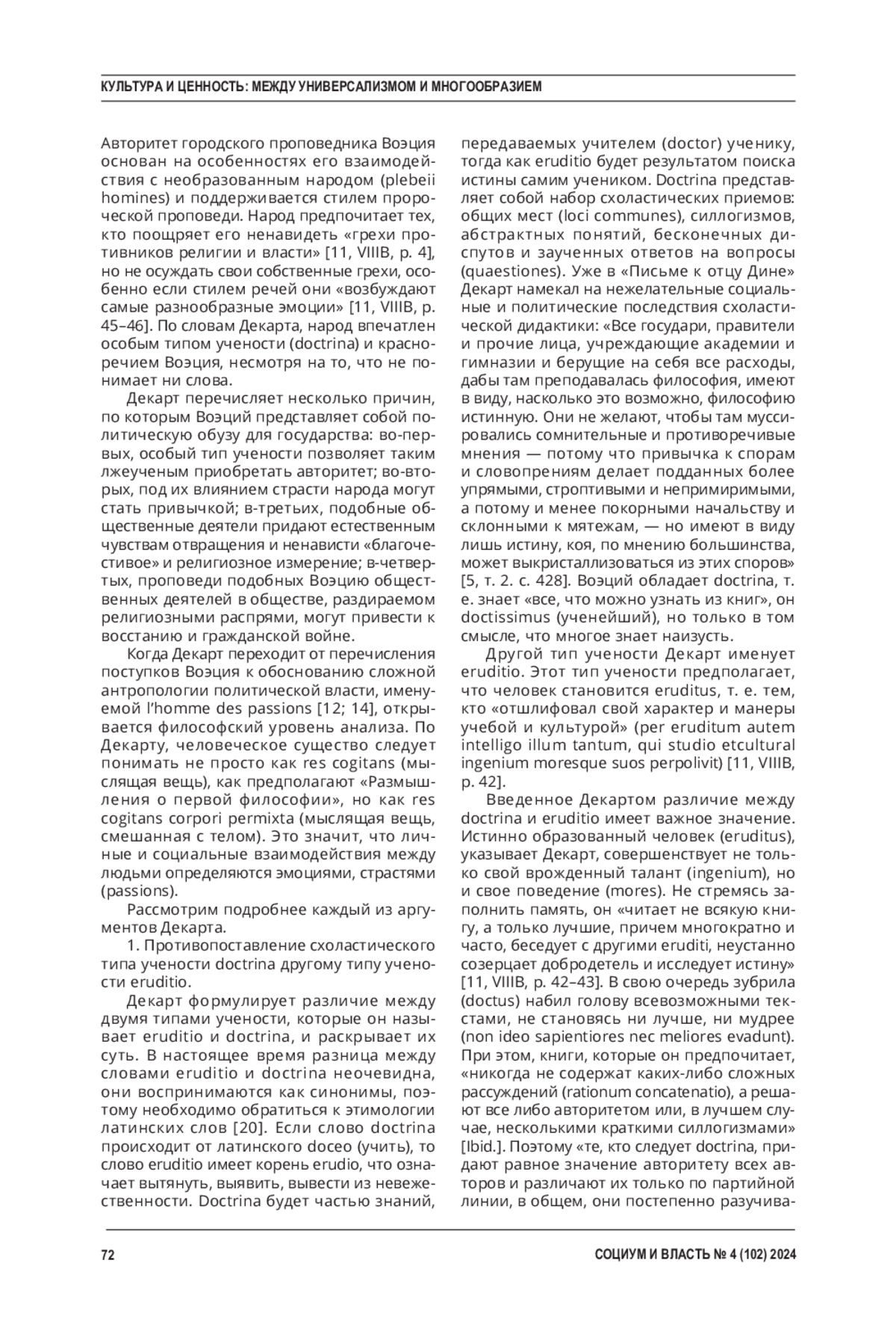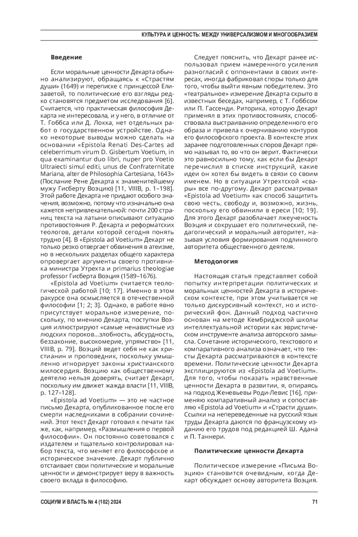 Если моральные ценности Декарта обычно анализируют, обращаясь к «Страстям души» (1649) и переписке с принцессой Елизаветой, то политические его взгляды ред - ко становятся предметом исследования [6]. Считается, что практическая философия Декарта не интересовала, и у него, в отличие от Т. Гоббса или Д. Локка, нет отдельных работ о государственном устройстве. Однако некоторые выводы можно сделать на основании «Epistola Renati Des-Cartes ad celeberrimum virum D. Gisbertum Voetium, in qua examinantur duo libri, nuper pro Voetio Ultraiecti simul editi, unus de Confraternitate Mariana, alter de Philosophia Cartesiana, 1643» (Послание Рене Декарта к знаменитейшему мужу Гисберту Воэцию) [11, VIIIB, р. 1–198]. Этой работе Декарта не придают особого значения, возможно, потому что изначально она кажется непривлекательной: почти 200 страниц текста на латыни описывают ситуацию противостояния Р. Декарта и реформатских теологов, детали которой сегодня понять трудно [4]. В «Epistola ad Voetium» Декарт не только резко отвергает обвинения в атеизме, но в нескольких разделах общего характера опровергает аргументы своего противника министра Утрехта и primarius theologiae professor Гисберта Воэция (1589–1676).