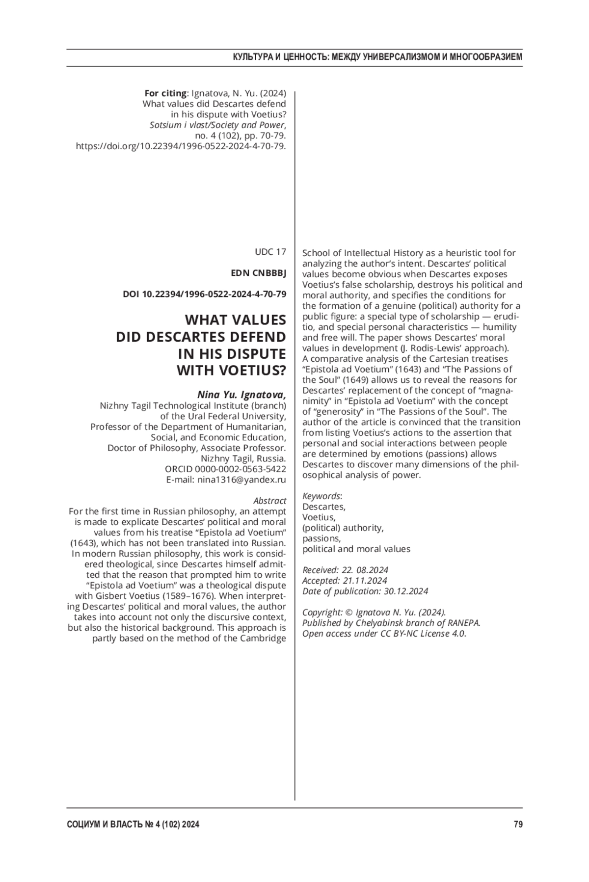 Впервые в отечественной философии предпринимается попытка эксплицировать политические и моральные ценности Декарта из его не переведенного на русский язык трактата «Epistola ad Voetium» (1643). В современных отечественной философии эта работа рассматривается как теологическая, поскольку сам Декарт признавал, что причиной, побудившей его написать «Epistola ad Voetium», был теологический спор с Гисбертом Воэцием (1589-1676). При интерпретации политических и моральных ценностей Декарта автор учитывает не только дискурсивный контекст, но и исторический фон. Данный подход частично основан на методе Кембриджской школы интеллектуальной истории как эвристическом инструменте анализа авторского замысла. Политические ценности Декарта становится очевидными, когда Декарт разоблачает лжеученость Воэция, разрушает его политический и моральный авторитет и указывает условия формирования подлинного (политического) авторитета общественного деятеля: особый тип учености - eruditio - и особые личностные характеристики - смирение и свобода воли. Моральные ценности Декарта показаны в развитии (подход Ж. Роди-Левис). Компаративный анализ картезианских трактатов «Epistola ad Voetium» (1643) и «Страсти души» (1649) позволяет раскрыть причины замены Декартом понятия «великодушие» в «Epistola ad Voetium» на понятие «щедрость » в «Страстях души». Автор статьи убежден, что переход от перечисления поступков Воэция к утверждению, что личные и социальные взаимодействия между людьми определяются эмоциями (страстями) позволяет Декарту открыть множество измерений философского анализа власти.