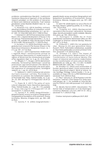 20. Шмаков, В. С. Локальные сообщества Евразии: геокультурный аспект / В. С. Шмаков // Мир науки. Социология, филология, культурология. - 2022. - Т. 13, - № 2. - URL: https://sfk-mn.ru/PDF/46SCSK222.pdf (дата обращения: 15.01.2023). EDN: MARQBY