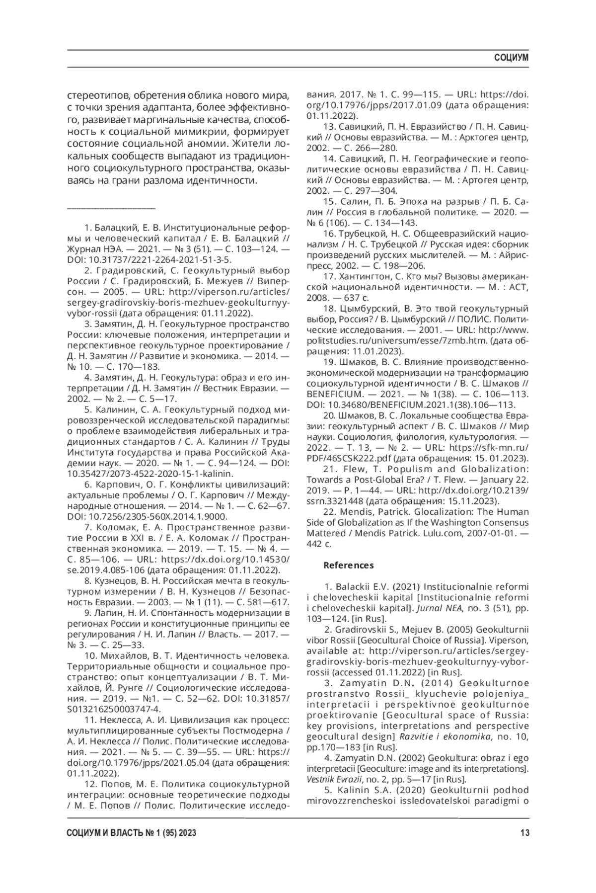 5. Калинин, С. А. Геокультурный подход мировоззренческой исследовательской парадигмы: о проблеме взаимодействия либеральных и традиционных стандартов / С. А. Калинин // Труды Института государства и права Российской Академии наук. - 2020. - № 1. - С. 94-124. -. DOI: 10.35427/2073-4522-2020-15-1-kalinin EDN: KZUQQH