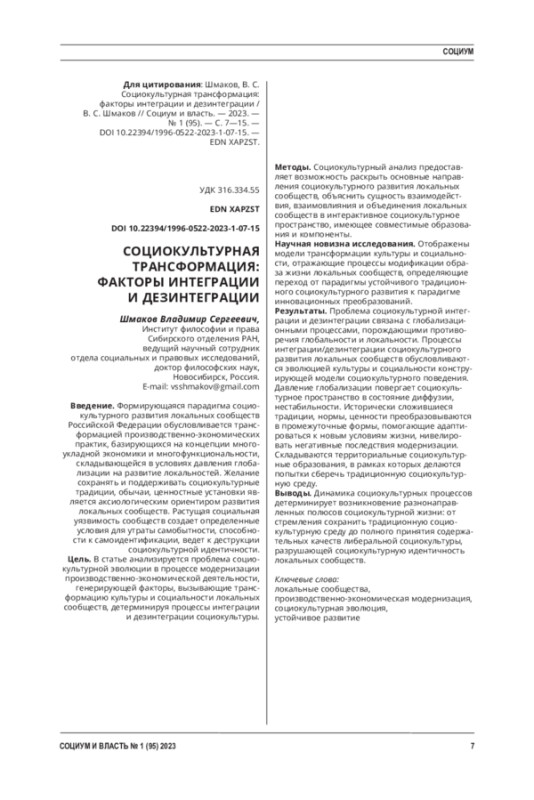 Результаты. Проблема социокультурной интеграции и дезинтеграции связана с глобализационными процессами, порождающими противоречия глобальности и локальности. Процессы интеграции/дезинтеграции социокультурного развития локальных сообществ обусловливаются эволюцией культуры и социальности конструирующей модели социокультурного поведения. Давление глобализации повергает социокультурное пространство в состояние диффузии, нестабильности. Исторически сложившиеся традиции, нормы, ценности преобразовываются в промежуточные формы, помогающие адаптироваться к новым условиям жизни, нивелировать негативные последствия модернизации. Складываются территориальные социокультурные образования, в рамках которых делаются попытки сберечь традиционную социокультурную среду.