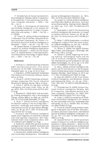 20. Zawacki-Richter, O. Systematic review of research on artificial intelligence applications in higher education - where are the educators? / O. Zawacki-Richter // International Journal of Educational Technology in Higher Education. - 2019. - Vol. 16. - Iss. 39.