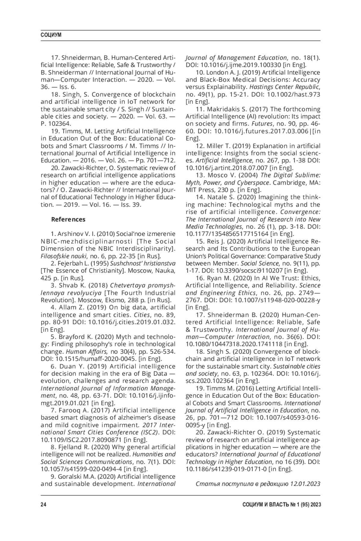 17. Shneiderman, B. Human-Centered Artificial Intelligence: Reliable, Safe & Trustworthy / B. Shneiderman // International Journal of Human-Computer Interaction. - 2020. - Vol. 36. - Iss. 6. EDN: ENPGDI