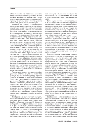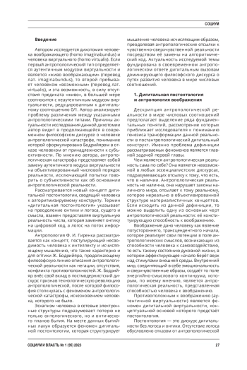 Выводы. Антропологическая реальность находится в состоянии бифуркации, из которой она может выйти несколькими путями, наиболее вероятными из которых будут пути деантропологизации в алгоритмических потоках и кодах дигитальной среды, либо путь сохранения феноменов самовоздействия, живого воображения, связанных с субъективностью и полем аутентичной виртуальности.