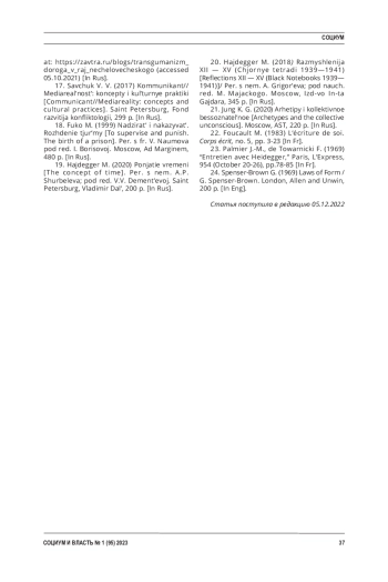Выводы. Обращение к модернизационным стратегиям на примере трансгуманизма является закономерной и необходимой потребностью в политико-правовой сфере, в частности. В процессе анализа был обозначен широкий спектр проблем, которые актуализируют социальные и аксиологические и антропологические оптики исследований. Многообразные формы трансгуманистических политических направлений выступают как проявления социально-правовой рефлексии на интенсификацию инновационизма, который способен радикально изменить человеческую природу.
