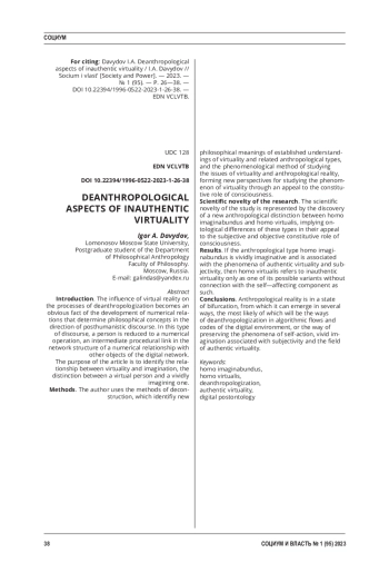 Введение. Влияние виртуальной реальности на процессы деантропологизации становится очевидным фактом развития числовых соотношений, детерминирующих философские концепты в направлении постгуманистического дискурса. В данном типе дискурса человек низведён до числовой операции, промежуточного процессуального звена в сетевой структуре числового соотношения с другими объектами дигитальной сети.