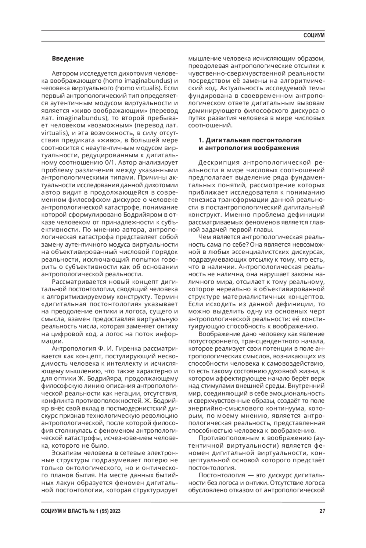 Автором исследуется дихотомия человека воображающего (homo imaginabundus) и человека виртуального (homo virtualis). Если первый антропологический тип определяется аутентичным модусом виртуальности и является «живо воображающим» (перевод лат. imaginabundus), то второй пребывает человеком «возможным» (перевод лат. virtualis), и эта возможность, в силу отсутствия предиката «живо», в большей мере соотносится с неаутентичным модусом виртуальности, редуцированным к дигитальному соотношению 0/1. Автор анализирует проблему различения между указанными антропологическими типами. Причины актуальности исследования данной дихотомии автор видит в продолжающейся в современном философском дискурсе о человеке антропологической катастрофе, понимание которой сформулировано Бодрийяром в отказе человеком от принадлежности к субъективности. По мнению автора, антропологическая катастрофа представляет собой замену аутентичного модуса виртуальности на объективированный числовой порядок реальности, исключающий попытки говорить о субъективности как об основании антропологической реальности.