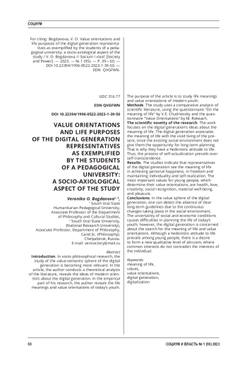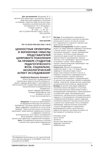 Введение. В социально-философских исследованиях большую актуальность приобретает изучение ценностно-смысловой сферы цифрового поколения. В статье автор проводит теоретический анализ литературы, раскрывает представления современных ученых о цифровом поколении. В эмпирической части своего исследования автор выявляет жизненные смыслы и ценностные ориентиры современной молодежи.