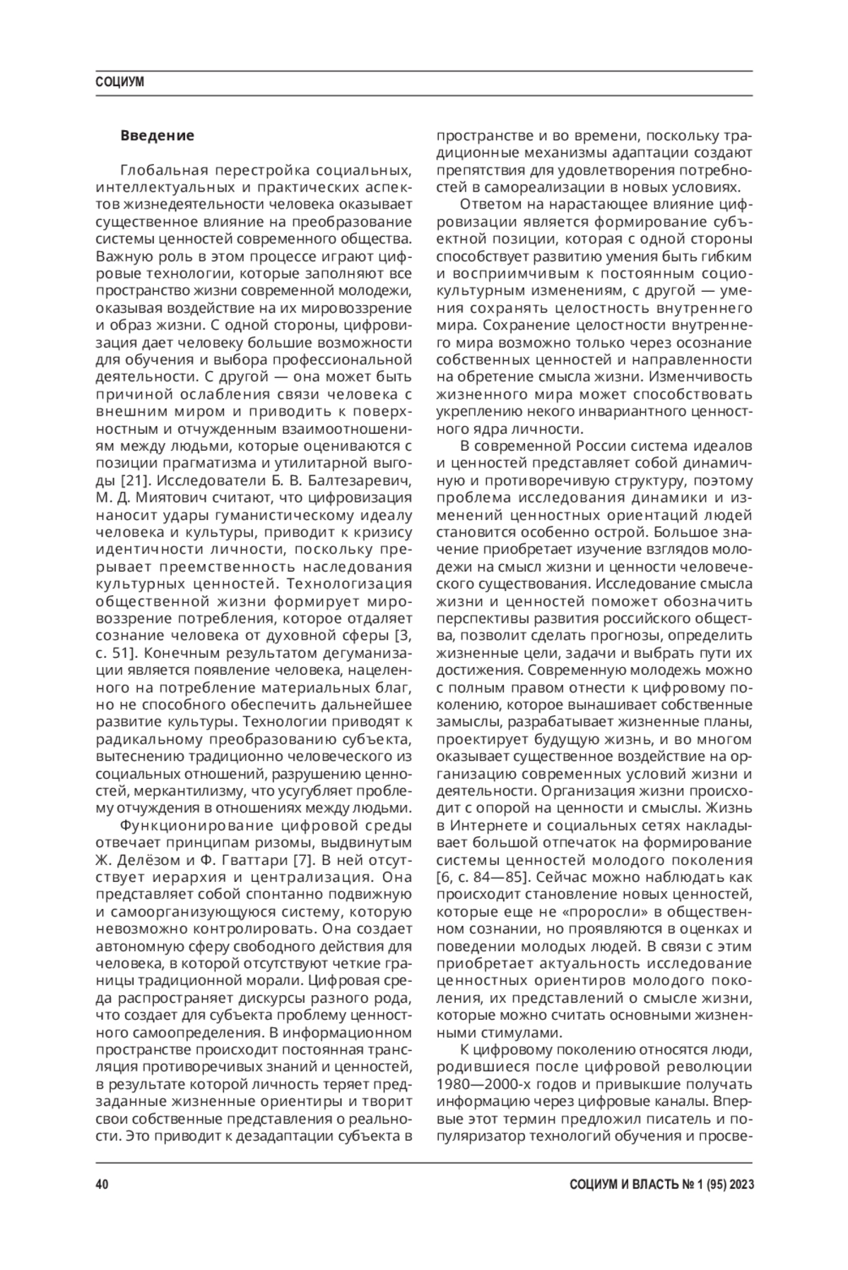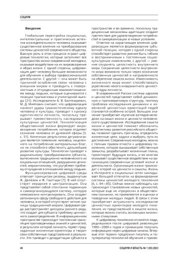 Глобальная перестройка социальных, интеллектуальных и практических аспектов жизнедеятельности человека оказывает существенное влияние на преобразование системы ценностей современного общества. Важную роль в этом процессе играют цифровые технологии, которые заполняют все пространство жизни современной молодежи, оказывая воздействие на их мировоззрение и образ жизни. С одной стороны, цифровизация дает человеку большие возможности для обучения и выбора профессиональной деятельности. С другой — она может быть причиной ослабления связи человека с внешним миром и приводить к поверхностным и отчужденным взаимоотношениям между людьми, которые оцениваются с позиции прагматизма и утилитарной выгоды [21]. Исследователи Б. В. Балтезаревич, М. Д. Миятович считают, что цифровизация наносит удары гуманистическому идеалу человека и культуры, приводит к кризису идентичности личности, поскольку прерывает преемственность наследования культурных ценностей.