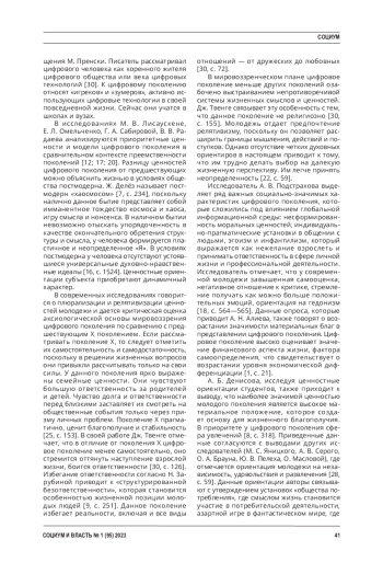 Выводы. В ценностной сфере цифрового поколения можно обнаружить отсутствие четких долгосрочных ориентиров в связи с непрерывными изменениями, происходящими в социальной среде. Неопределенность социальных, экономических условий вызывает трудности в планировании жизнедеятельности у современной молодежи, однако цифровое поколение озабочено поиском смысла жизни и ценностных ориентиров. Хотя у молодежи преобладает гедонистическое отношение к жизни, обнаруживается стремление к формированию нового качественного уровня альтруизма, где общие интересы не противоречат интересам личности.