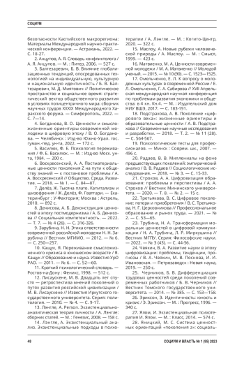 1. Алиева, Н. В. Специфика ценностей цифрового поколения в поликультурном регионе как фактор комплексной безопасности (на примере Астраханской области) / Н. В. Алиева // Проблемы комплексной безопасности Каспийского макрорегиона: Материалы Международной научно-практической конференции. - Астрахань, 2022. - С. 18-27. EDN: VDTCRM