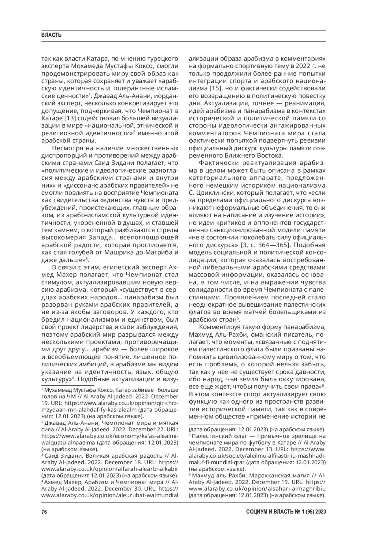 Выводы. Показано, что Чемпионат актуализировал политические противоречия в восприятии исторического опыта, визуализируя линии идеологического разграничения между арабскими интеллектуалами, которые активно использовали спорт как информационный повод для обсуждения проблем исторической политики и политики коллективной памяти, включая восприятие места и роли авторитаризма, демократии и прав человека в современных мемориальных культурах. Автор полагает, что реакция элит на попытки либеральных средств массовой информации превратить спорт в пространство мемориальных конфликтов и войн памяти была минимальной, так как элиты сфокусированы на сохранении контроля и получении экономических дивидендов от проведения Чемпионата мира. Показано, что политизация спорта стала вкладом современных либеральных СМИ в обострение войн памяти как формы мемориальных конфликтов в арабском мире.