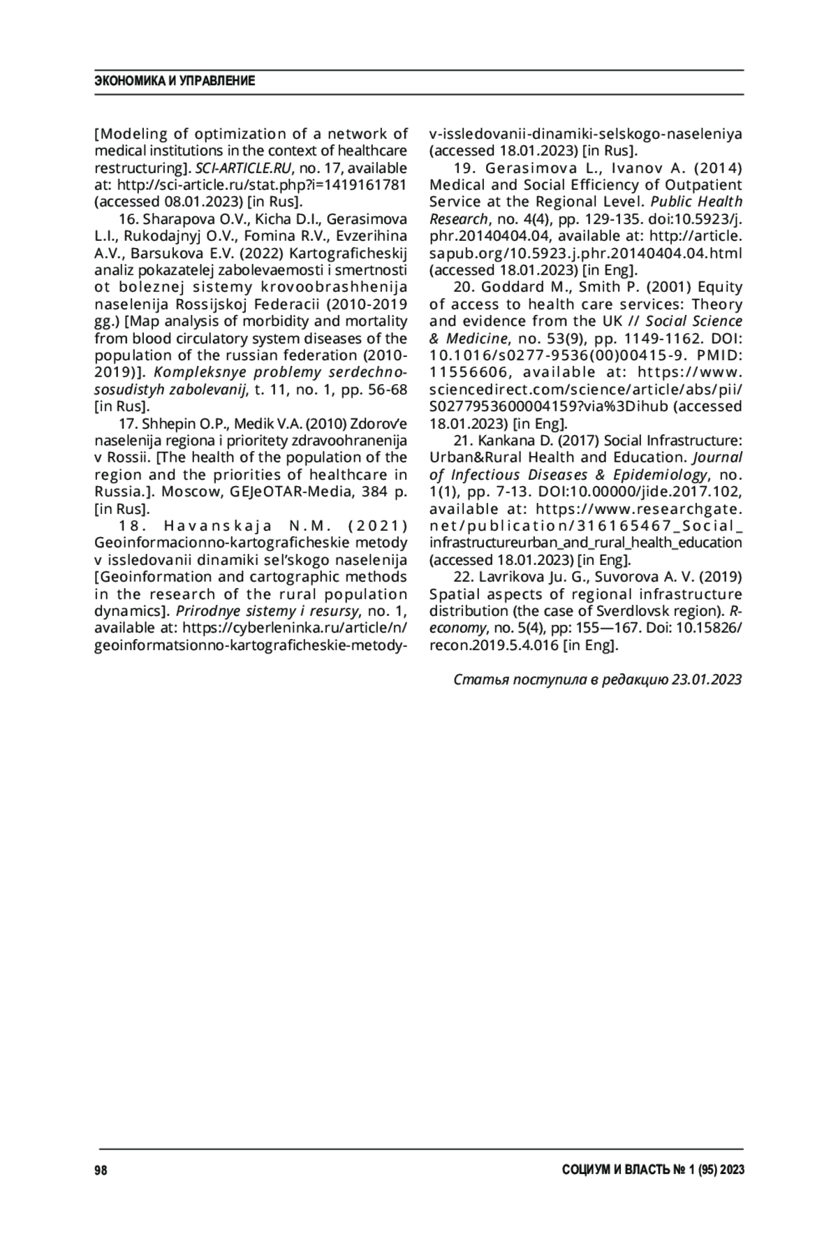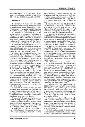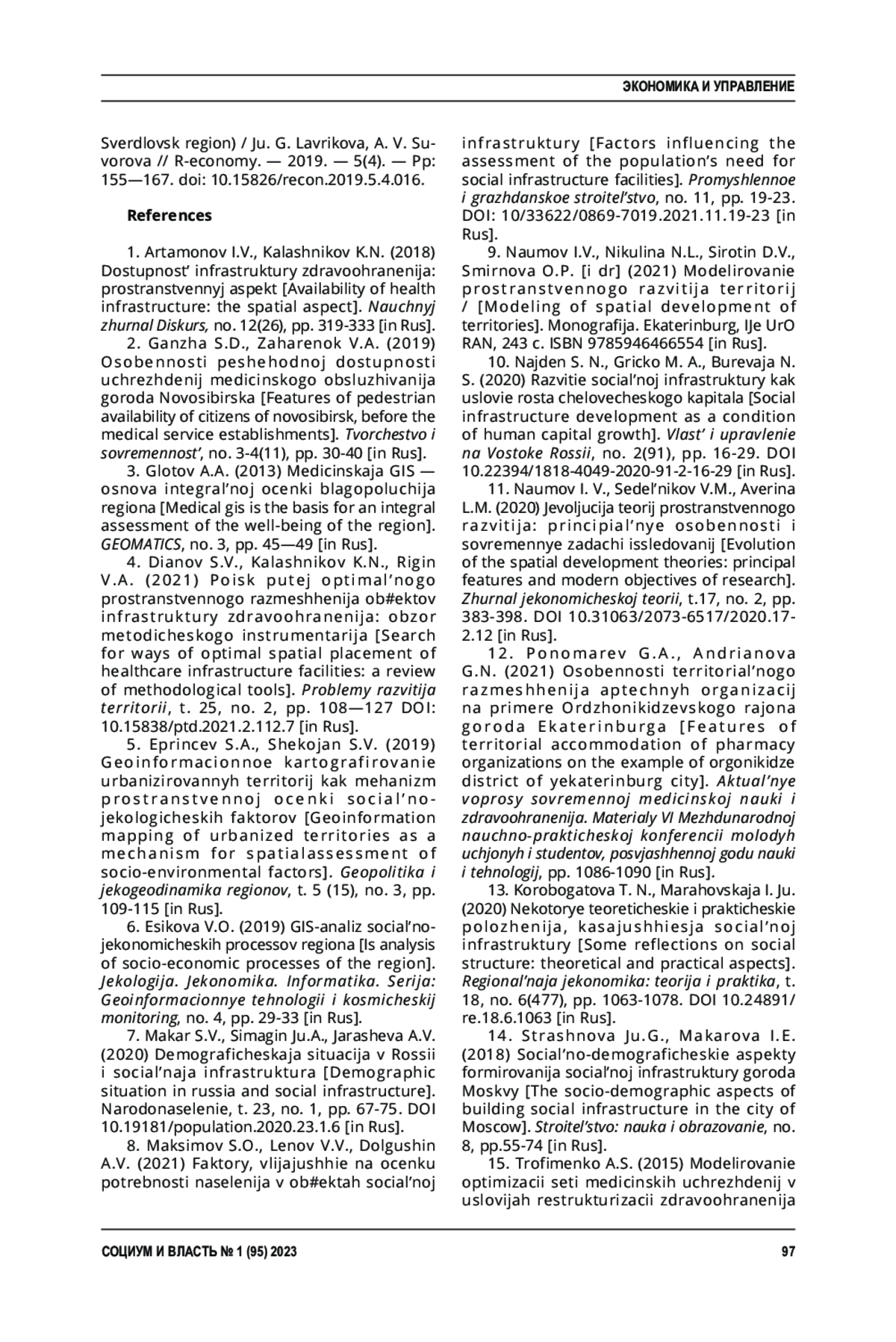 1. Артамонов, И. В. Доступность инфраструктуры здравоохранения: пространственный аспект / И. В. Артамонов, К. Н. Калашников // Научный журнал Дискурс. - 2018. - № 12(26). - С. 319-333. EDN: YTVKCT