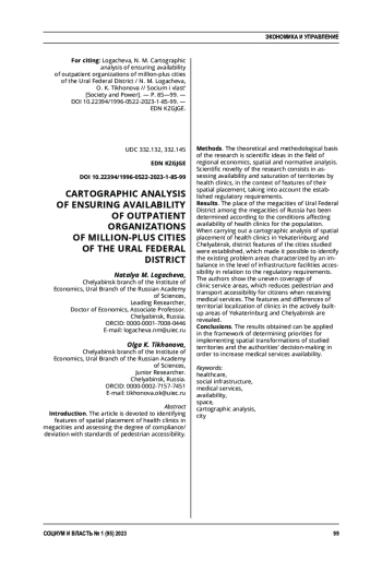 Результаты. Определено место городов-миллионников УрФО среди мегаполисов России по условиям, влияющим на доступность амбулаторно- поликлиничных организаций для населения. При осуществлении картографического анализа пространственного размещения амбулаторнополиклиничных организаций в Екатеринбурге и Челябинске установлены районные особенности исследованных городов, что дало возможность определить существующие проблемные территории, для которых характерен дисбаланс в уровне доступности объектов инфраструктуры относительно нормативных требований. Показана неравномерность покрытия зонами обслуживания поликлиник, что снижает для горожан пешеходно-транспортную доступность при получении медицинских услуг. Выявлены особенности и различия территориальной локализации поликлиник в активно застраиваемых районах Екатеринбурга и Челябинска.