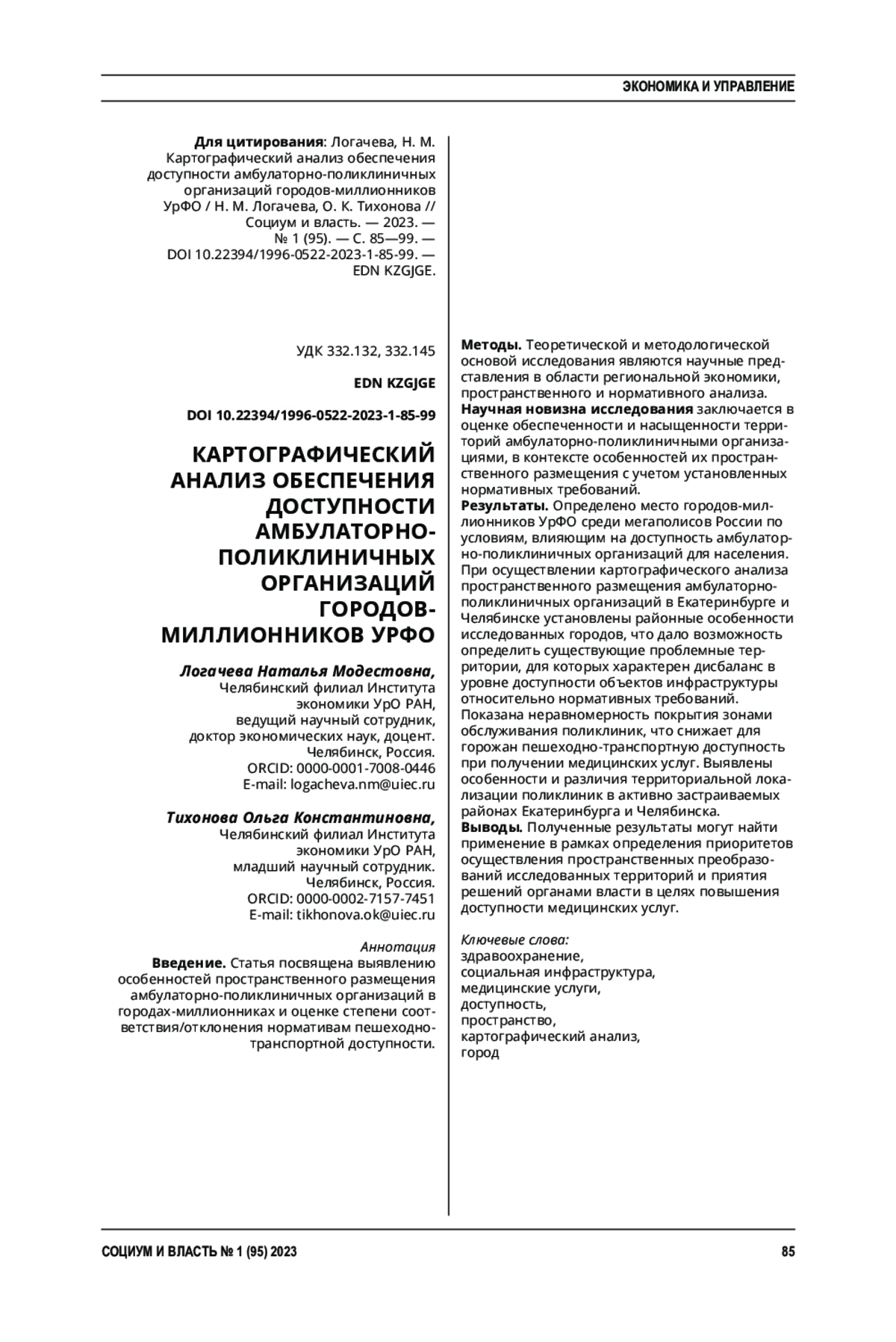 Введение. Статья посвящена выявлению особенностей пространственного размещения амбулаторно-поликлиничных организаций в городах-миллионниках и оценке степени соответствия/ отклонения нормативам пешеходно транспортной доступности.