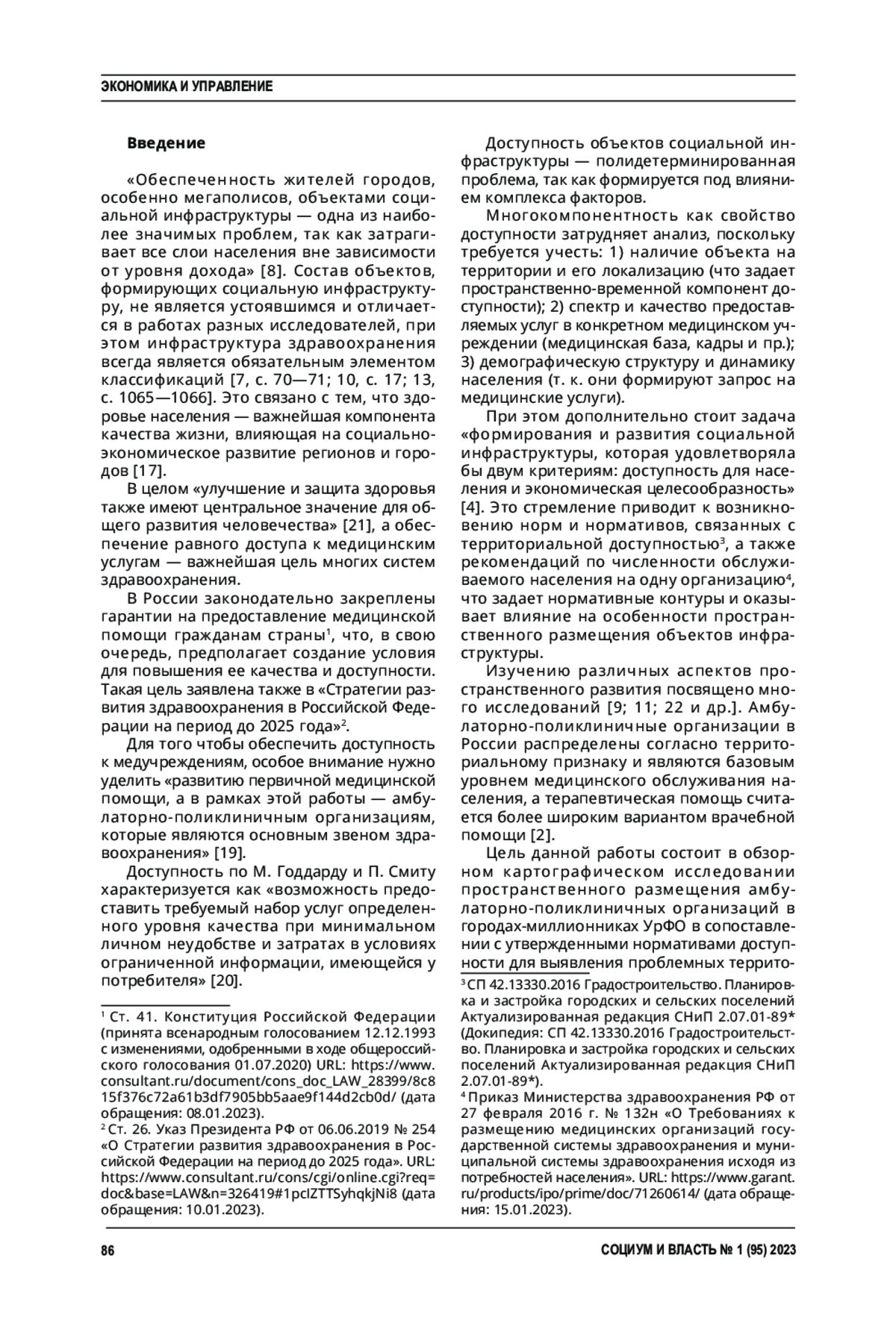 «Обеспеченность жителей городов, особенно мегаполисов, объектами социальной инфраструктуры — одна из наиболее значимых проблем, так как затраги - вает все слои населения вне зависимости от уровня дохода» [8]. Состав объектов, формирующих социальную инфраструктуру, не является устоявшимся и отличается в работах разных исследователей, при этом инфраструктура здравоохранения всегда является обязательным элементом классификаций [7, с. 70—71; 10, с. 17; 13, с. 1065—1066]. Это связано с тем, что здоровье населения — важнейшая компонента качества жизни, влияющая на социальноэкономическое развитие регионов и городов [17].