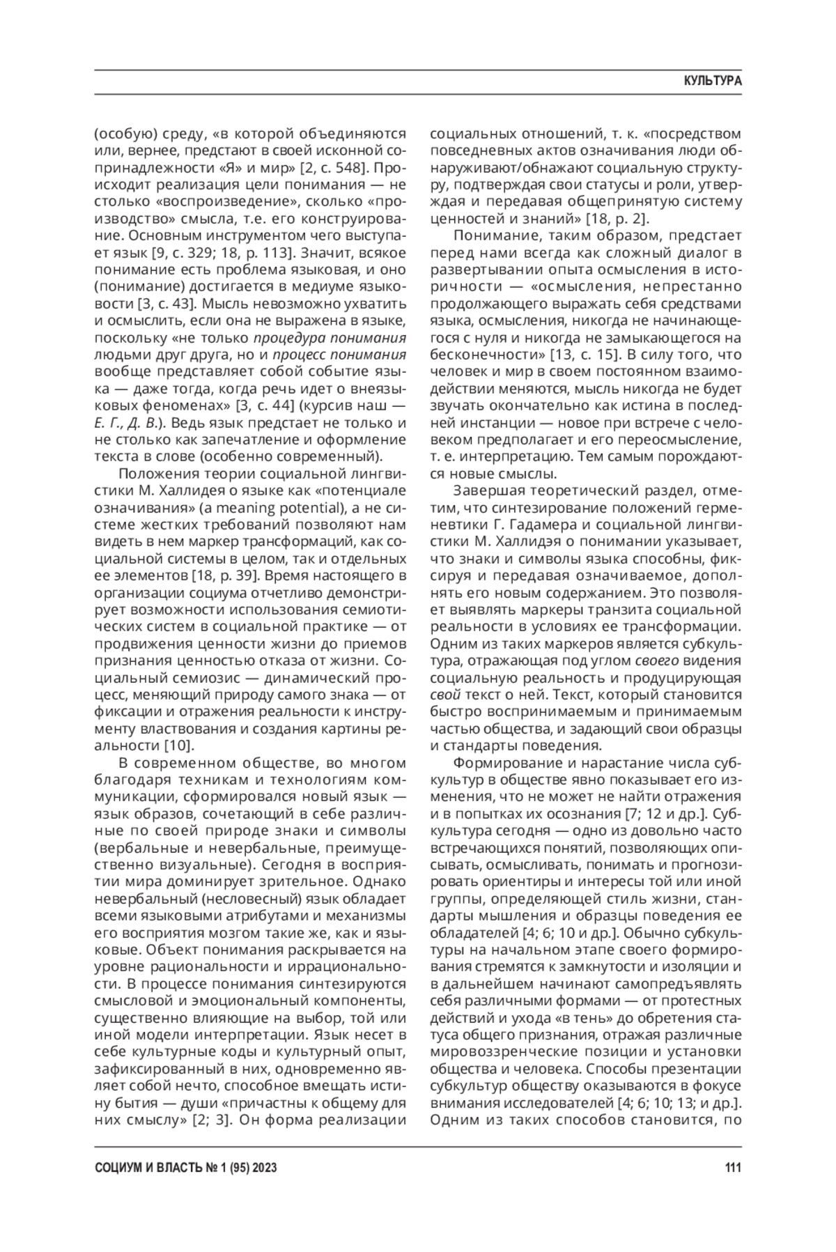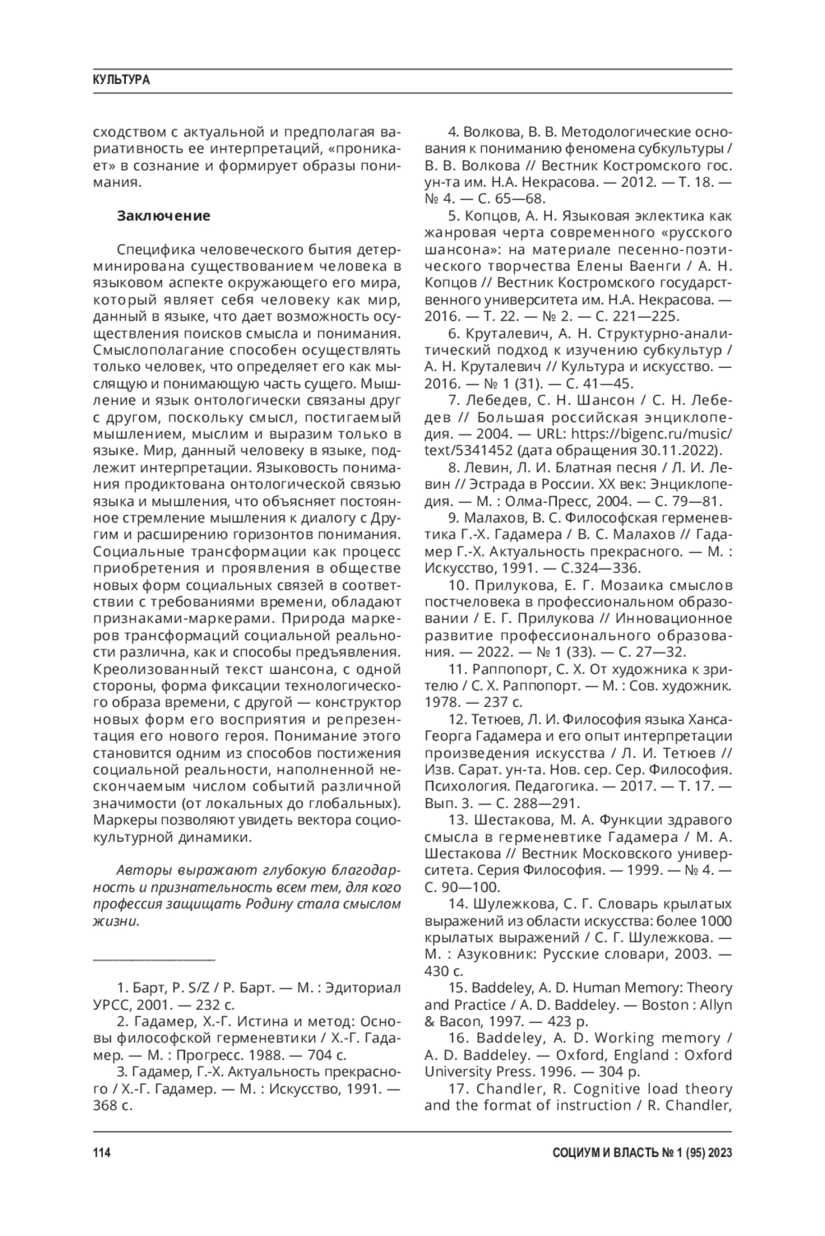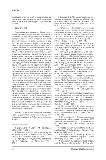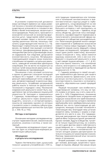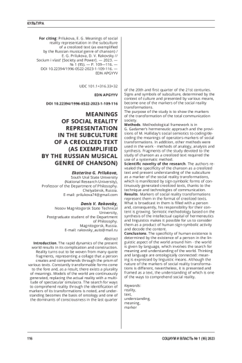 Методы. Методологические рамки - герменевтический подход Г. Гадамера и положения социальной семиотики М. Халлидэя к кодированию/ декодированию смыслов операторовмаркеров социальных трансформаций. Кроме того, использованы в работе и другие методы - методы аналогии, анализа и синтеза. Фрагменты исследования, посвященные изучению шансона как креолизованного текста, потребовали применения системного метода. Научная новизна исследования. Авторами выявлена специфика шансона как креолизованного текста. Представлено понимание субкультуры как маркера трансформаций социальной реальности, которая манифестируется знаковосимволическими формами непрерывно порождаемых креолизованных текстов благодаря технике и технологиям коммуникации.