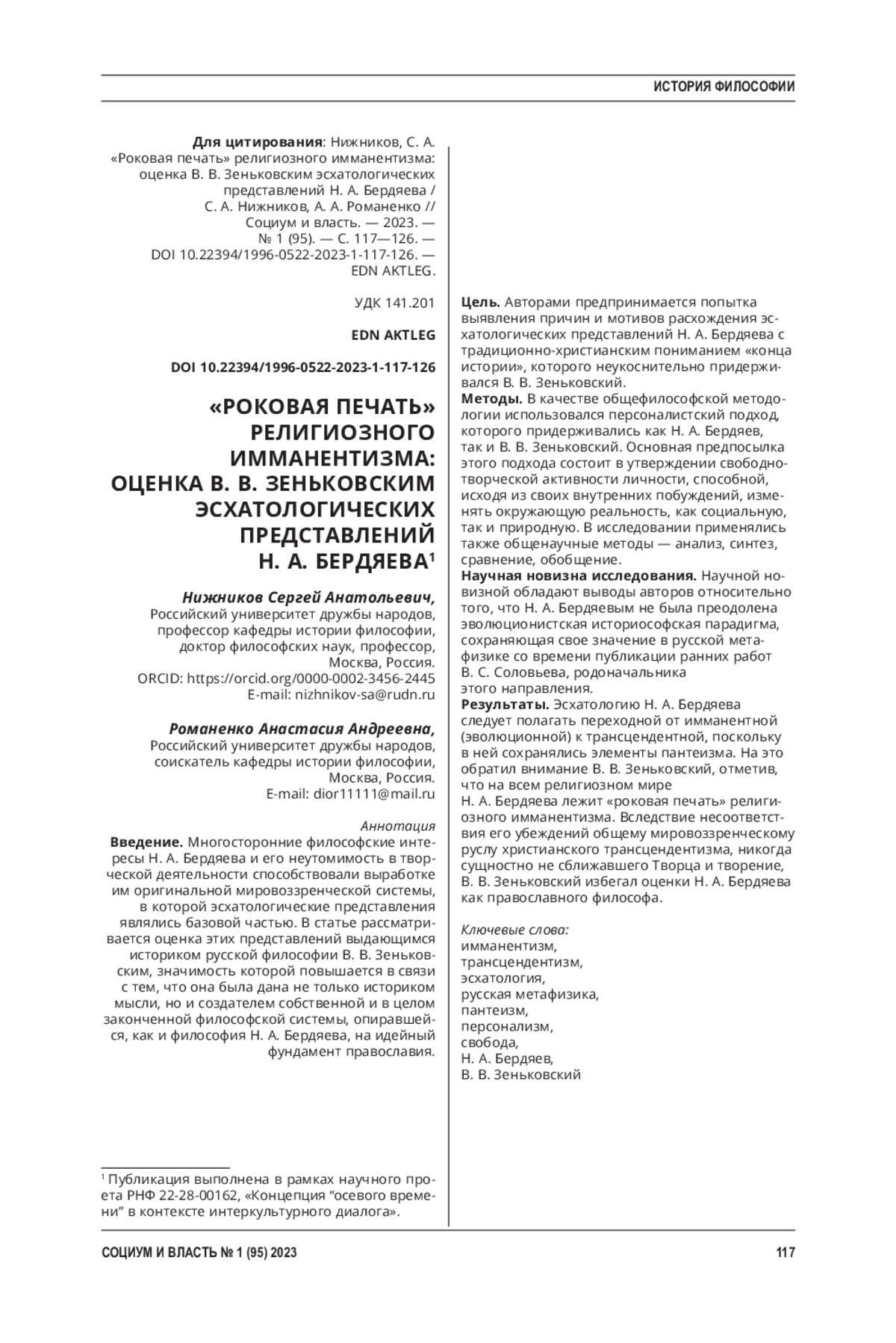 Введение. Многосторонние философские интересы Н. А. Бердяева и его неутомимость в творческой деятельности способствовали выработке им оригинальной мировоззренческой системы, в которой эсхатологические представления являлись базовой частью. В статье рассматривается оценка этих представлений выдающимся историком русской философии В. В. Зеньковским, значимость которой повышается в связи с тем, что она была дана не только историком мысли, но и создателем собственной и в целом законченной философской системы, опиравшейся, как и философия Н. А. Бердяева, на идейный фундамент православия.