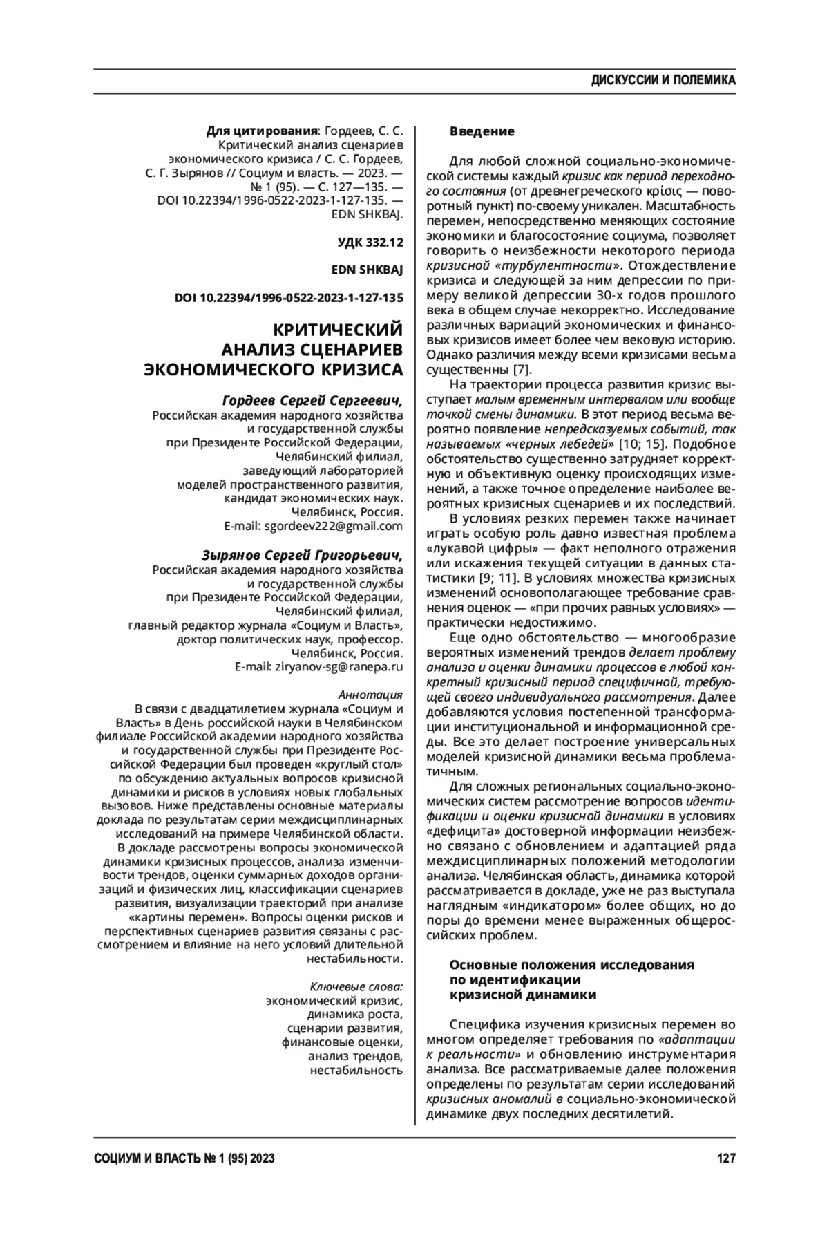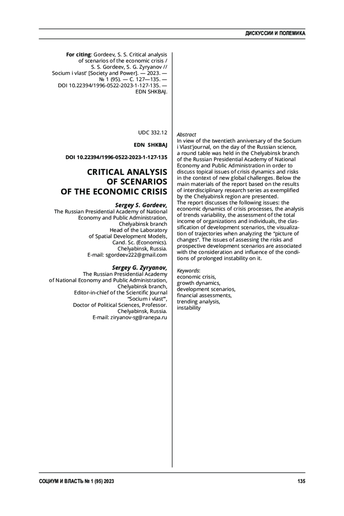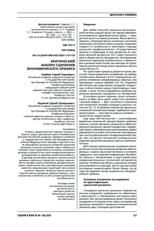 В связи с двадцатилетием журнала «Социум и Власть» в День российской науки в Челябинском филиале Российской академии народного хозяйства и государственной службы при Президенте Российской Федерации был проведен «круглый стол» по обсуждению актуальных вопросов кризисной динамики и рисков в условиях новых глобальных вызовов. Ниже представлены основные материалы доклада по результатам серии междисциплинарных исследований на примере Челябинской области. В докладе рассмотрены вопросы экономической динамики кризисных процессов, анализа изменчивости трендов, оценки суммарных доходов организаций и физических лиц, классификации сценариев развития, визуализации траекторий при анализе «картины перемен». Вопросы оценки рисков и перспективных сценариев развития связаны с рассмотрением и влияние на него условий длительной нестабильности.