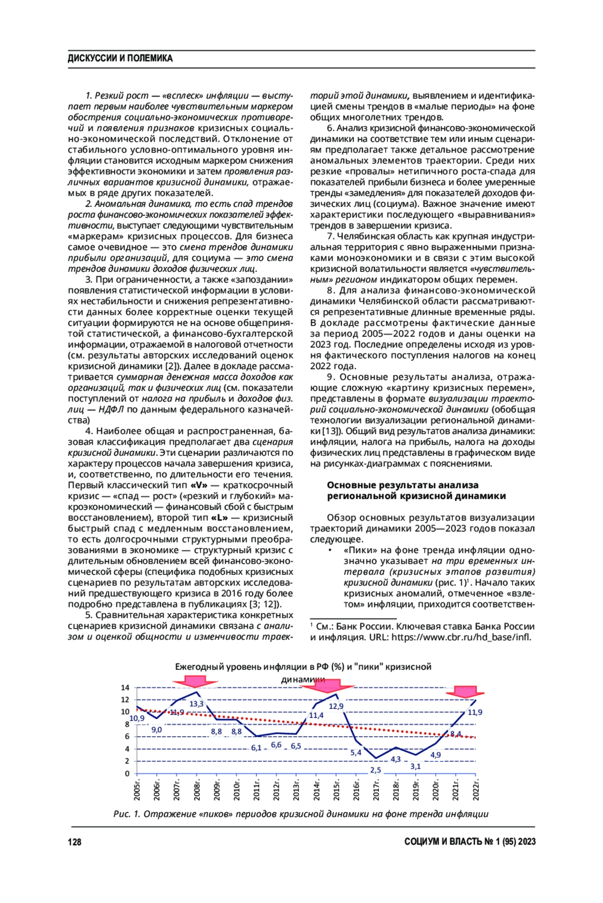 1. Резкий рост — «всплеск» инфляции — выступает первым наиболее чувствительным маркером обострения социально-экономических противоречий и появления признаков кризисных социально-экономической последствий. Отклонение от стабильного условно-оптимального уровня инфляции становится исходным маркером снижения эффективности экономики и затем проявления различных вариантов кризисной динамики, отражаемых в ряде других показателей