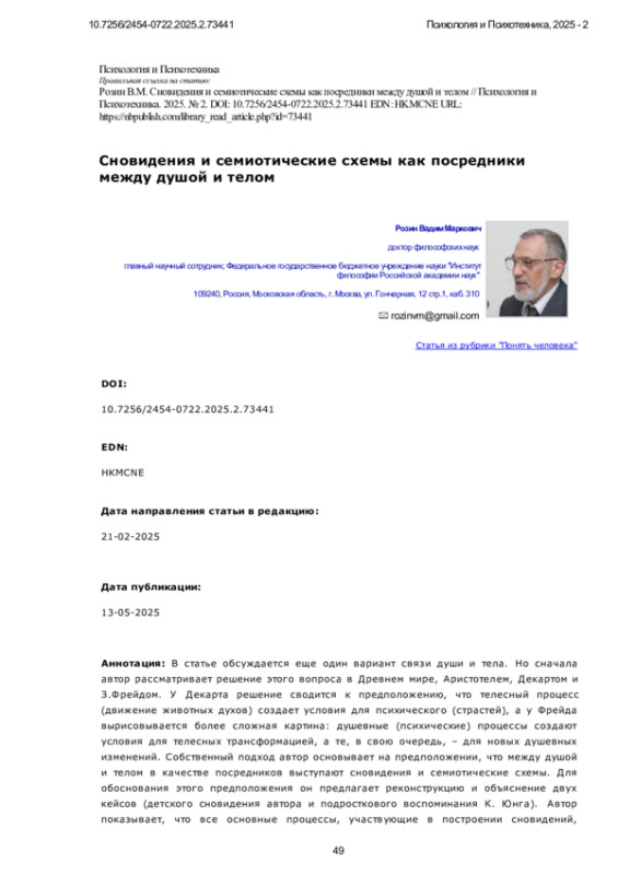 В статье обсуждается еще один вариант связи души и тела. Но сначала автор рассматривает решение этого вопроса в Древнем мире, Аристотелем, Декартом и З. Фрейдом. У Декарта решение сводится к предположению, что телесный процесс (движение животных духов) создает условия для психического (страстей), а у Фрейда вырисовывается более сложная картина: душевные (психические) процессы создают условия для телесных трансформацией, а те, в свою очередь, - для новых душевных изменений. Собственный подход автор основывает на предположении, что между душой и телом в качестве посредников выступают сновидения и семиотические схемы. Для обоснования этого предположения он предлагает реконструкцию и объяснение двух кейсов (детского сновидения автора и подросткового воспоминания К. Юнга). Автор показывает, что все основные процессы, участвующие в построении сновидений, двояки: и психологические, т. е. относящиеся к душе, и физиологические, относящиеся к телу. Так желание как программа, это с одной стороны, семиотическое и психическое образования, в которых посредством языка заданы события, подлежащие реализации. С другой стороны, программа - физиологический процесс, создающий в организме давление и напряжение, требующие разрешения. Двойная природа программ и других процессов сновидения позволяет считать сновидения посредниками между душой и телом. В рациональном осмыслении главную роль играет построение схем. Схема - это построение (изобретение) индивида, позволяющая разрешить проблемную ситуацию, задать тем самым новую реальность и видение, открыть возможность по-новому действовать. В конце статьи автор проблематизирует вопрос о желании психолога и медика получить ответ на вопрос о том, как устроены механизмы, позволяющие переходить от души к телу и обратно, обусловливающие эти переходы. На его взгляд, подобная постановка вопроса не совсем правильная. Не переходы, а взаимообусловленность, одновременное действие души и тела, посредниками между которыми выступают сновидения и схемы.