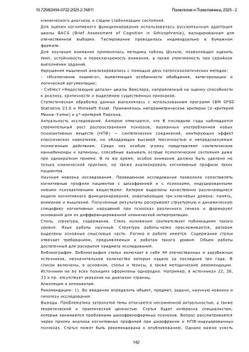 Настоящее исследование направлено на анализ и сопоставление когнитивных профилей при расстройствах различного генеза: эндогенного, представленного случаями шизофрении, и экзогенного, обусловленного употреблением новых психоактивных веществ (НПВ), преимущественно синтетических катинонов и каннабиноидов. Объектом изучения являются особенности нарушений когнитивной деятельности, проявляющиеся в таких функциональных областях, как память, внимание и мышление. Исследование предполагает выявление различий в структуре, выраженности и потенциальной устойчивости этих нарушений, что приобретает особую значимость в контексте современной дифференциальной диагностики. Сравнительный анализ когнитивных характеристик при состояниях различного происхождения позволяет не только уточнить представления о закономерностях их формирования, но и заложить основы для индивидуализированного подхода к восстановлению когнитивных функций в рамках реабилитационной терапии, с учётом специфики нарушений в каждой из групп. Использовались шкала BACS, таблицы Шульте, методика «Исключение лишнего» и субтест «Недостающие детали» теста Векслера. В работе представлены систематизированные различия когнитивных характеристик пациентов с шизофренией и НПВ-индуцированными психозами. Установлено, что при шизофрении преобладают нарушения в области семантической обработки, вербальной памяти и устойчивого внимания, отличающиеся стабильностью. В группе НПВ-психозов доминируют регуляторные и исполнительные дефициты, включая ослабление произвольного контроля, снижение объёма рабочей памяти и ситуативные ошибки мышления. Эти нарушения, в отличие от шизофренического профиля, характеризуются большей лабильностью. Полученные данные уточняют представления о когнитивной организации психотических состояний разного происхождения и могут быть использованы в практике дифференциальной диагностики, а также при построении индивидуальных программ когнитивной коррекции. Несмотря на различия, обе группы показывают сходные трудности в гибкости мышления и внимании, что может затруднять дифференциацию в остром периоде. Выявленные профили позволяют точнее разграничивать психозы различного генеза и служат основой для построения индивидуализированных программ когнитивной коррекции с учётом специфики нарушений в каждой группе.