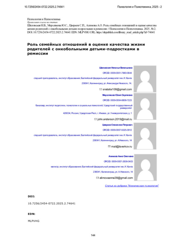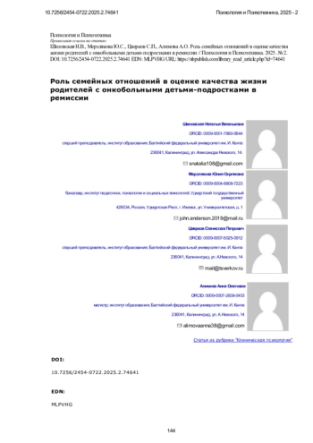 6. Шиловская Н. В., Главатских М. М., Реверчук И. В. Копинг-поведение ближайших родственников онкобольных детей в ремиссии как фактор их качества жизни // Educational Bulletin Consciousness. 2025. Vol. 27, No. 1. P. 11-25. DOI: 10.26787/nydha-2686-6846-2025-27-1-11-25