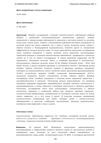 Предмет исследования. Ситуация онкологического заболевания ребенка связана с длительным психоэмоциональным напряжением родителя, которое сохраняется в период выхода заболевания в ремиссию и негативно влияет на качество жизни всех членов семьи. Тревога и беспокойство родителей негативно сказываются на качестве жизни как самого родителя, так и семьи в целом. Качество жизни, наряду с ответом опухоли и безрецидивной выживаемостью, является одним из показателей эффективности лечения детского рака. В статье представлены результаты исследования связи семейных отношений и оценки качества жизни родителей, воспитывающих подростков имеющих в анамнезе онкологические заболевания, находящиеся в ремиссии сроком до 5 лет на момент исследования. В группе родителей подростков (N=70) оценивались показатели качества жизни и семейной адаптации и сплоченности. Использовались опросник качества жизни SF-36 (Medical Outcomes Study - Short Form Health Survey) и шкала семейной адаптации и сплоченности FACES-3. Факторный анализ методом главных компонент позволил выявить 6 факторов семейных отношений, влияющих на жизнеспособность семьи и качество жизни: физическое функционирование (0,567), психическое здоровье (0,688), социальное функционирование (0,571), жизненная активность (0,634), сплоченность (0,730), гибкость (0,607). Впервые исследована связь семейных отношений и качества жизни родителей подростков с онкозаболеваниями в ремиссии. Полученные данные демонстрируют, что семейные отношения родителей подростков характеризуются высокой степенью сплоченности и взаимозависимости, а также гибкостью и некоторой хаотичности в процессе адаптации. Результаты исследования могут быть использованы специалистами в области психологии, медицины и социальной работы для создания программ социально-психологической реабилитации, направленной на улучшение качества жизни не только самого подростка, но и его семьи в целом. В качестве основных направлений психологических интервенций для семей, имеющих детей с онкологическими заболеваниями в ремиссии необходимо рассматривать развитие целеполагания, внутренних опор родителей и семьи в целом.