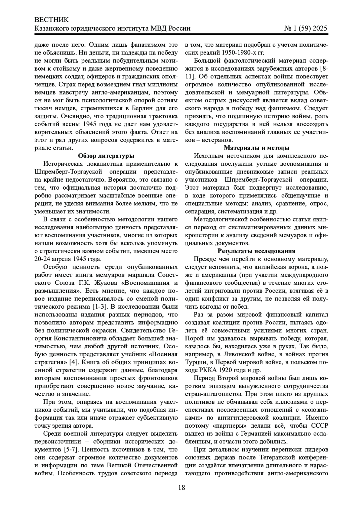 Материалы и методы: исходным источником для комплексного исследования послужили воспоминания и опубликованные дневниковые записи реальных участников Шпремберг-Торгауской операции. Методологическую особенность статьи составил переход от микроистории к анализу сведений мемуаров и официальных документов. Все, что ранее рассматривалось как частное, а иногда как случайное, оказалось в центре нашего исследовательского интереса. В связи с этим такой подход дал возможность по-иному взглянуть на давно известные события.