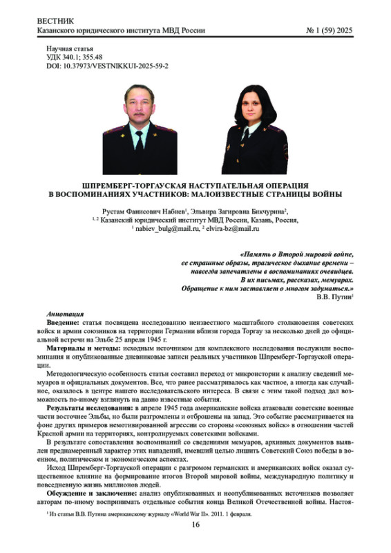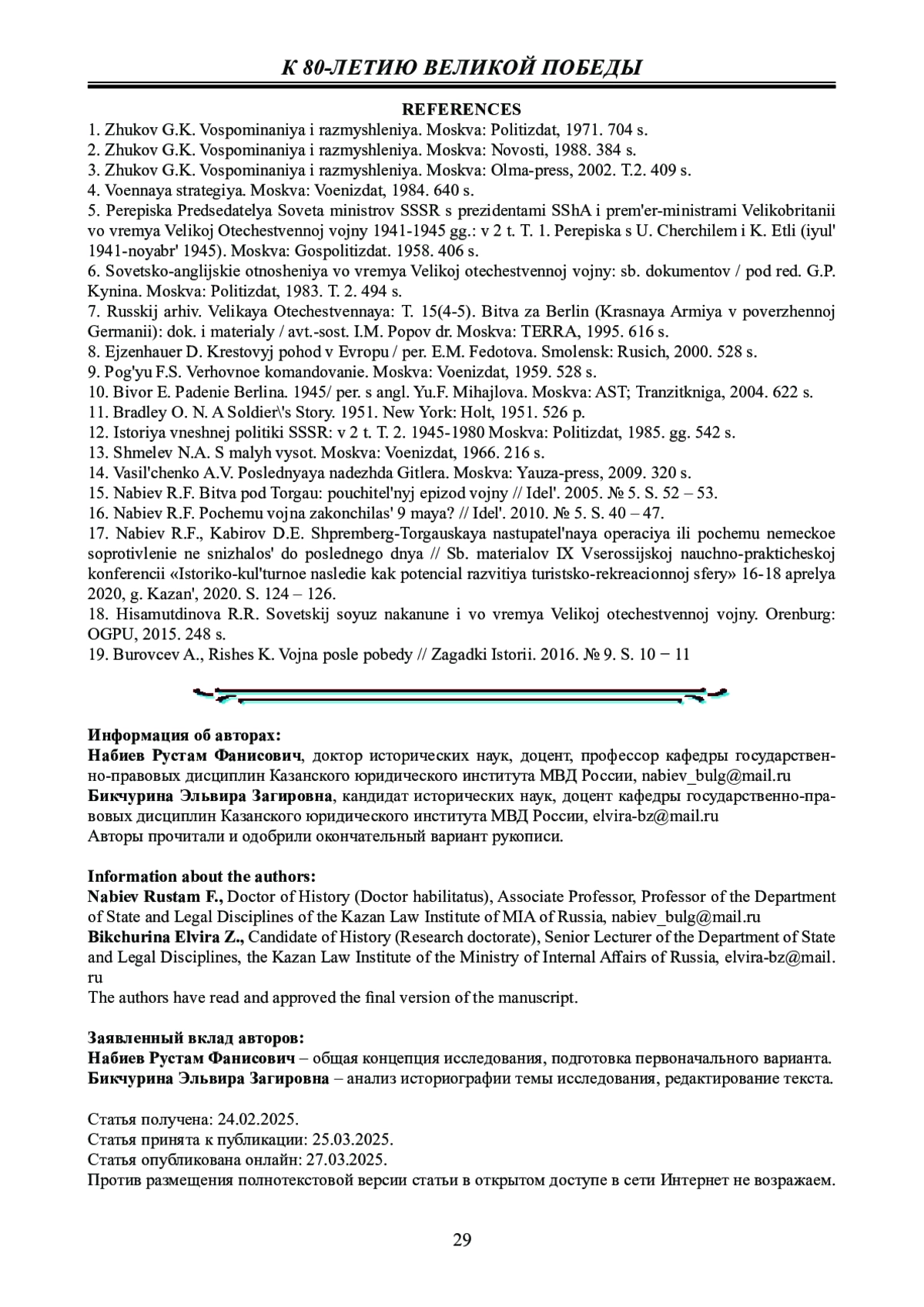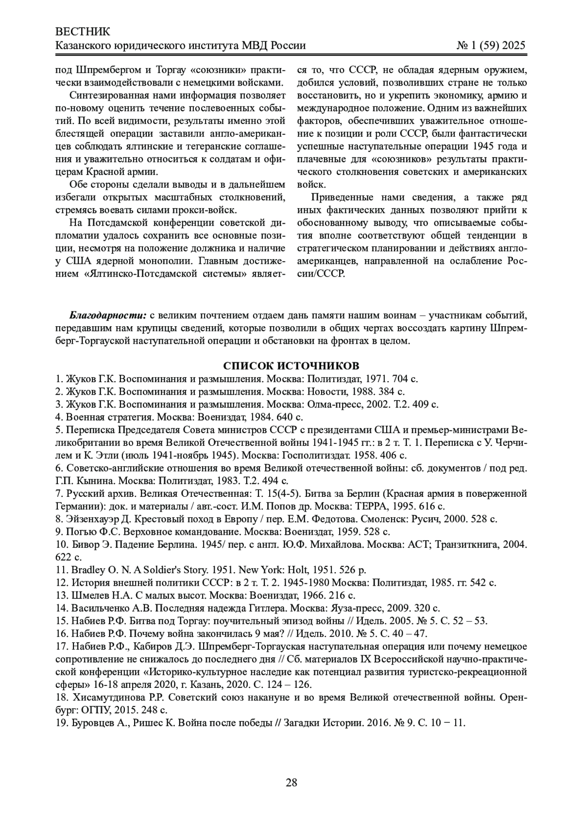 17. Набиев Р.Ф., Кабиров Д.Э. Шпремберг-Торгауская наступательная операция или почему немецкое сопротивление не снижалось до последнего дня // Сб. материалов IX Всероссийской научно-практической конференции “Историко-культурное наследие как потенциал развития туристско-рекреационной сферы” 16-18 апреля 2020, г. Казань, 2020. С. 124 - 126. EDN: MWCXBJ