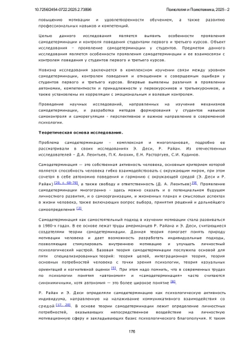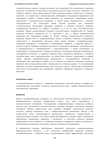Предметом данного исследования являются особенности проявления самодетерминации и ее взаимосвязи с контролем поведения у студентов первого и третьего курсов. Авторы подробно рассматривают теоретические основы самодетерминации в рамках теории Деси и Райана, включая базовые психологические потребности (автономия, компетентность, принадлежность). Особое внимание уделяется сравнительному анализу показателей самодетерминации и поведенческого контроля у студентов разных курсов. Авторы исследуют, как изменяются эти показатели в процессе обучения, и выявляют статистически значимые различия между группами. Показано, что студенты первого курса демонстрируют более высокий уровень автономии и волевого контроля, в то время как у третьекурсников наблюдается повышенная тревожность при совершении ошибок. Особый акцент делается на выявленных корреляциях между автономией и эмоциональным контролем, а также между тревожностью и чувством принадлежности. Эти результаты имеют важное значение для понимания психологических механизмов адаптации студентов к учебному процессу. Выборку исследования составили 41 студент в возрасте от 17 до 21 года. Психологические методики: Шкала удовлетворения базовых психологических потребностей (M. Gagne), опросник Контроль поведения (Е. А. Сергиенко и др.) и Шкала направленности мотивации при совершении ошибки (K. Schell). Методы математической статистики: критерий Манна-Уитни и корреляционный анализ Спирмана. Новизна исследования заключается в комплексном изучении связи между уровнем самодетерминации, контролем поведения и отношением к совершаемым ошибкам у студентов первого и третьего курсов. Впервые выявлены различия в проявлении автономии, компетентности и принадлежности у первокурсников и третьекурсников, а также установлены их корреляции с эмоциональным и волевым контролем. Основными выводами проведенного исследования являются: у студентов первого курса показатели автономии и волевого контроля выше, чем у третьекурсников, что может быть связано с адаптацией к учебной среде; уровень самодетерминации коррелирует с эмоциональным контролем и мотивацией при совершении ошибок, но не зависит от возраста студентов; выявлена обратная связь между автономией и тревожностью по поводу ошибок, что подчеркивает важность развития самодетерминации для снижения стресса. Результаты исследования могут быть использованы для разработки стратегий поддержки студентов в процессе обучения.