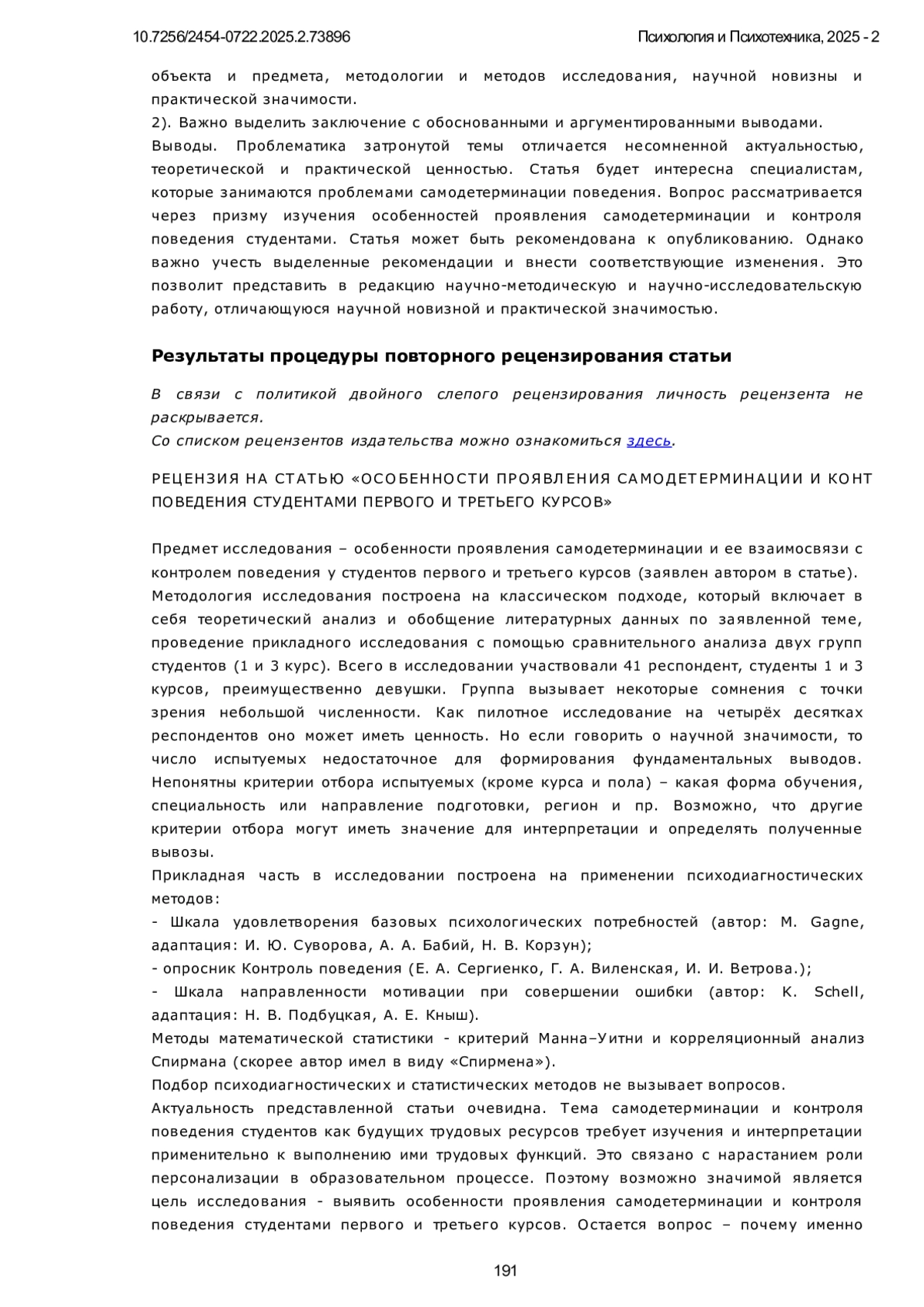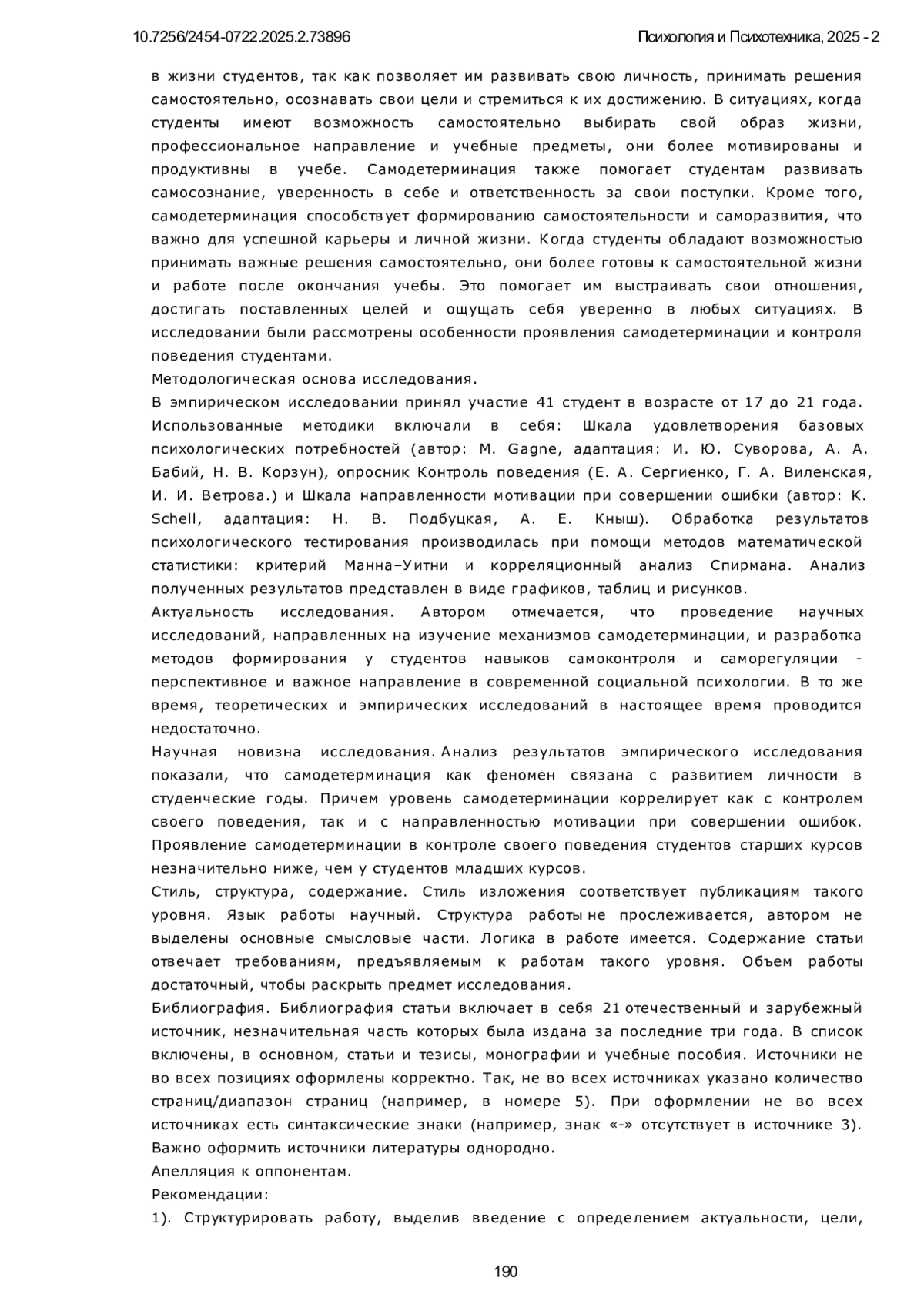 2. Борзова Т. В., Плотникова Е. С. Проявление самодетерминации в личностной, деятельностной и социальной самореализации студентов // Психолог. - 2020. - № 4. - С. 12-21. DOI: 10.25136/2409-8701.2020.4.33082