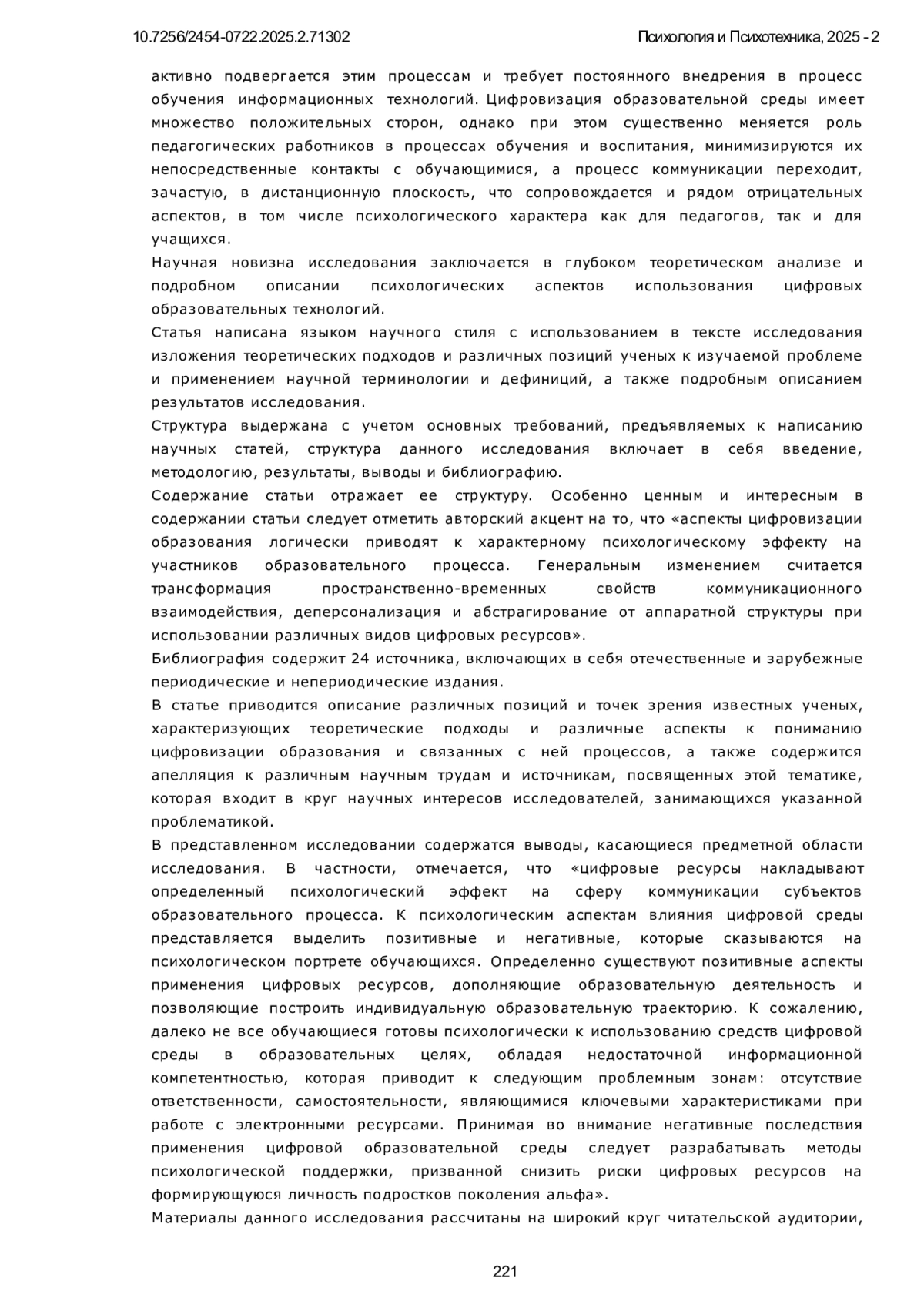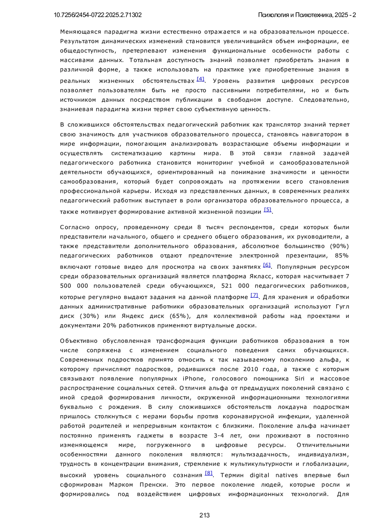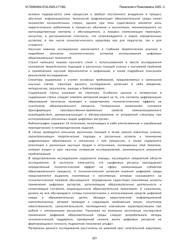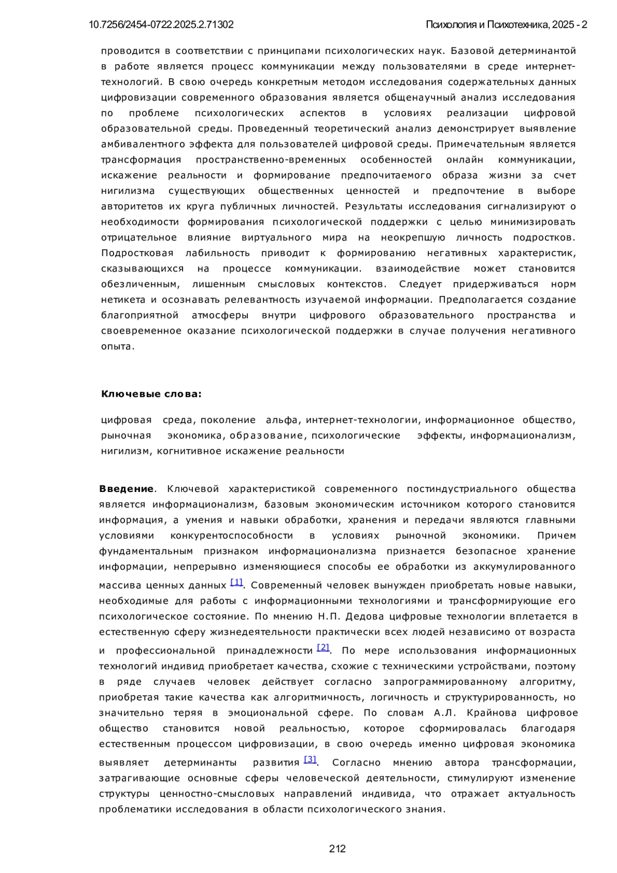 2. Дедов Н. П. Психологические особенности использования цифровых технологий в образовательной деятельности / Н. П. Дедов, О. А. Комиссарова, И. В. Кохова, О. Э. Петруня // Вестник евразийской науки. 2023. Т. 15. №1. URL: https://esj.today/PDF/35FAVN123.pdf.