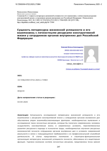 Актуальность исследования метаресурса жизненной успешности и его взаимосвязи с ресурсами конструктивной жизни у сотрудников органов внутренних дел обусловлена рядом взаимообусловливающих факторов: необходимостью выявления и исследования таких личностных ресурсов, которые бы помогали современному человеку осуществлять конструктивную жизнь в современных условиях, перспективностью развития ресурсного подхода в психологии труда; необходимостью изучения ресурсных возможностей личности сотрудников органов внутренних дел в условиях современной реальности в связи с повышающимися требованиями к их профессиональной служебной деятельности. В статье представлено понимание и структурно-функциональная организация метаресурса жизненной успешности личности, обоснована его акцепторная функция. Уделено внимание системе личностных ресурсов, представлена точка зрения на организацию ресурсов конструктивной жизни личности. В исследовании приняло участие 892 сотрудника органов внутренних дел Российской Федерации, из них 388 женщин и 504 мужчины. Диагностические методики направлены на измерение таких ресурсов конструктивной жизни личности, как: мотивационные и психологические состояния; интегративные личностные характеристики, способствующие эффективному и успешному преодолению жизненных трудностей; характеристики субъектности. Основные результаты проведенного исследования свидетельствуют о том, что метаресурс жизненной успешности, как сложное многокомпонентное интегративное образование, имеет устойчивые взаимосвязи со многими показателями личностных ресурсов конструктивной жизни в исследуемой выборке сотрудников органов внутренних дел Российской Федерации. В результате проведения корреляционного анализа установлено большое количество значимых взаимосвязей компонентов метаресурса жизненной успешности с показателями личностных ресурсов конструктивной жизни. При этом компонент эмоциональные переживания (в частности, нравственные и бытийные переживания) имеет наименьшее количество значимых корреляций с показателями ресурсов конструктивной жизни. Метаресурс жизненной успешности, как сложное многокомпонентное интегративное образование, имеет устойчивые взаимосвязи со многими показателями личностных ресурсов конструктивной жизни в исследуемой выборке сотрудников органов внутренних дел Российской Федерации. Это позволяет сделать предположение о наличии в системе ресурсов респондентов определенных «ядерных» связей, которые участвуют в организации конструктивной жизни. Новизна и значимость полученных в представленном исследовании результатов заключается в том, что предложено понимание метаресурса жизненной успешности, основной функцией которого является акцепторная.