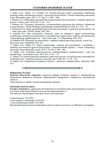 5. Епихин А.Ю., Тасаков С.В., Гришина Е.П. Теоретико-правовая модель соотношения публичного, частного начал и одноименных интересов в уголовном процессе России // Вестник Удмуртского университета. Серия: Экономика и право. 2023. Т. 33. Вып. 6. С. 1040 - 1046. ;. DOI: 10.35634/2412-9593-2023-33-6-1040-1046 EDN: DNSVGD