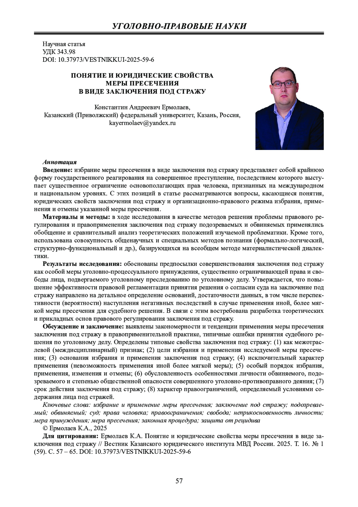 6. Широкова А.В. Заключение под стражу как элемент института мер пресечения в российском уголовном процессе // Закон и право. 2019. № 8. С. 101 - 103. ;. DOI: 10.24411/2073-3313-2019-10359 EDN: HJUIWB