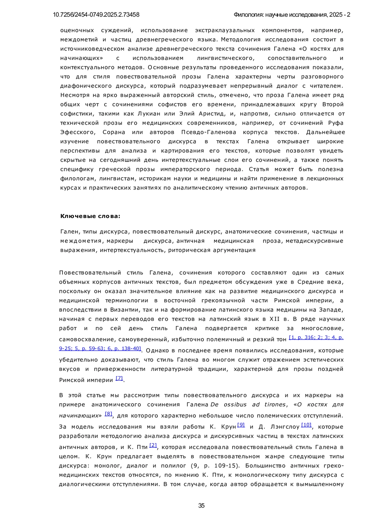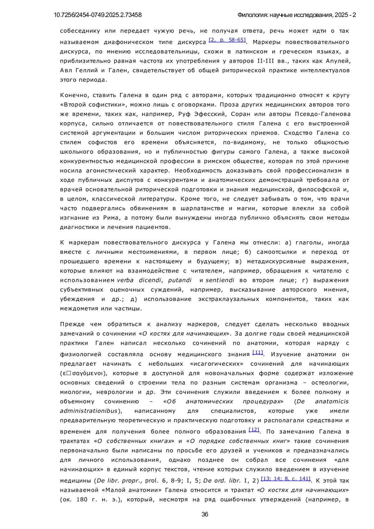 Значительную часть объемного корпуса текстов Галена (129-210/217 AD) составляют сочинения, написанные в жанре повествовательной прозы. Предметом исследования данной статьи выступают его анатомические сочинения, в частности, сочинение «О костях для начинающих», а объектом исследования - разные типы повествовательного дискурса в его сочинениях и их лингвистические маркеры. Особое внимание уделяется таким чертам, как высказывания от первого лица в единственном и множественном числе, самоотсылки, переходы от прошедшего времени к настоящему и будущему, метадискурсивные выражения, которые влияют на взаимодействие с читателем, например, обращения к читателю с использованием глаголов речи и мысли во втором лице, выражения авторского мнения, убеждения или высказывания оценочных суждений, использование экстраклаузальных компонентов, например, междометий и частиц древнегреческого языка. Методология исследования состоит в источниковедческом анализе древнегреческого текста сочинения Галена «О костях для начинающих» с использованием лингвистического, сопоставительного и контекстуального методов. Основные результаты проведенного исследования показали, что для стиля повествовательной прозы Галена характерны черты разговорного диафонического дискурса, который подразумевает непрерывный диалог с читателем. Несмотря на ярко выраженный авторский стиль, отмечено, что проза Галена имеет ряд общих черт с сочинениями софистов его времени, принадлежавших кругу Второй софистики, такими как Лукиан или Элий Аристид, и, напротив, сильно отличается от технической прозы его медицинских современников, например, от сочинений Руфа Эфесского, Сорана или авторов Псевдо-Галенова корпуса текстов. Дальнейшее изучение повествовательного дискурса в текстах Галена открывает широкие перспективы для анализа и картирования его текстов, которые позволят увидеть скрытые на сегодняшний день интертекстуальные слои его сочинений, а также понять специфику греческой прозы императорского периода. Статья может быть полезна филологам, лингвистам, историкам науки и медицины и найти применение в лекционных курсах и практических занятиях по аналитическому чтению античных авторов.