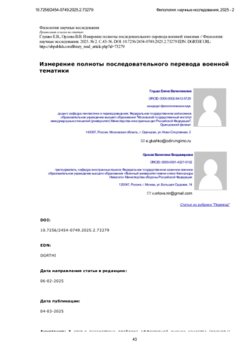 3. Ткачева Ю. Г., Черенков В. А. Основные трудности перевода текстов военной тематики // Теоретические и практические аспекты развития науки в современном мире: сборник статей международной научной конференции, Санкт-Петербург, 18 марта 2024 года. Санкт-Петербург: Частное научно-образовательное учреждение дополнительного профессионального образования Гуманитарный национальный исследовательский институт “Нацразвитие”, 2024. С. 34-37.