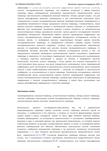 В статье рассмотрена проблема эффективной оценки качества (полноты) устного последовательного перевода, что особенно актуально в сфере военного перевода ввиду необходимости достижения максимальной тождественности текста перевода оригинальному сообщению военной тематики. Авторы делают акцент, что для оценки квалификации военного переводчика и для качественной подготовки таких специалистов в устном последовательном военном переводе возникает необходимость в разработке объективного метода оценивания полноты перевода. Соответственно, такая оценка качества перевода должна в минимальной степени зависеть от человеческого фактора (так называемой экспертной оценки) и более опираться на математические (количественные) методы оценивания качества. Целью данного исследования является разработка методологии объективной оценки полноты переводимой информации при устном последовательном военном переводе. Методология исследования состоит из четырех этапов: 1) проведение анализа существующих методов оценки качества последовательного перевода; 2) определение ключевых методов оценки полноты последовательного военного перевода, которые могут предоставлять объективные данные; 3) выделение метрик для расчета полноты последовательного перевода; 4) проведение тестовых расчетов. Научная новизна исследования состоит в том, что предлагается методика проведения количественной оценки смыслового содержания перевода в сравнении со смысловым содержанием текста оригинального высказывания с помощью подсчета пропозиций в каждом из текстов и проведения анализа результатов. Качество устного перевода с точки зрения его полноты оценивается за счет получения таких данных, как доля (процентного соотношение) точно переведенной информации, доля отступлений от оригинального смысла высказывания, доля искажений смысла и доля необоснованных дополнений - смыслов, не входящих в оригинальное сообщение, но использованных в тексте перевода. Результатом исследования является разработанный метод количественной оценки полноты переводимой информации при устном последовательном военном переводе, который дает практически исчерпывающую информацию о полноте осуществляемого перевода и может быть использован для оценки квалификации переводчика и качества перевода.