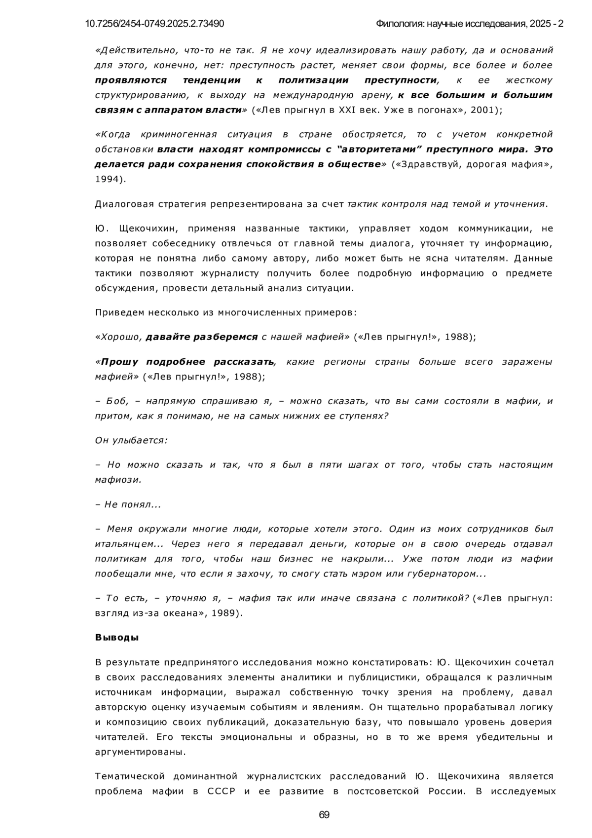 Предметом исследования является прагмастилистическая специфика жанра журналистского расследования, рассмотренная на примере газетных публикаций Ю. Щекочихина, стоявшего у истоков данного жанра. В эмпирическую базу исследования вошли журналистские расследования Ю. Щекочихина, объединенные общей темой, - появление и развитие организованной преступности, мафии в СССР и постсоветской России, опубликованные в «Литературной газете»: «Лев прыгнул!», «Лев прыгнул: взгляд из-за океана», «Под контролем мафии», «Охота на льва, или бой с тенью», «Гуров ушел… Лев съел?», «Чужой», «Здравствуй, дорогая мафия», а также расследования, вышедшие на страницах «Новой газеты»: «Хорошо живется тем, кто борется с мафией», «Лев прыгнул в XXI век. Уже в погонах». В исследовании используются общенаучные методы: наблюдение, сравнение, описание, систематизация эмпирического материала, а также методика прагмастилистического анализа текста. Актуальность и научная новизна исследования видится в том, что в настоящее время жанр журналистского расследования является востребованным, особую популярность приобрел формат тру-крайм, генетический восходящий к обозначенному жанру. Однако изучение исторического контекста данного жанра, его основ и базовых признаков важно и перспективно. Более того, в трудах отечественных ученых не представлено исследование журналистских расследований Ю. Щекочихина с точки зрения их подробного прагмастилистического анализа. Большинство работ посвящено изучению публицистического мастерства Ю. Щекочихина, хотя и эти исследования являются фрагментарными, фундаментальных монографических работ, посвященных журналистской деятельности автора, до сих пор не существует. В ходе исследования выявлены жанрообразующие черты журналистского расследования, определены доминантные коммуникативные стратегии и тактики, объективированные в публикациях Ю. Щекочихина.