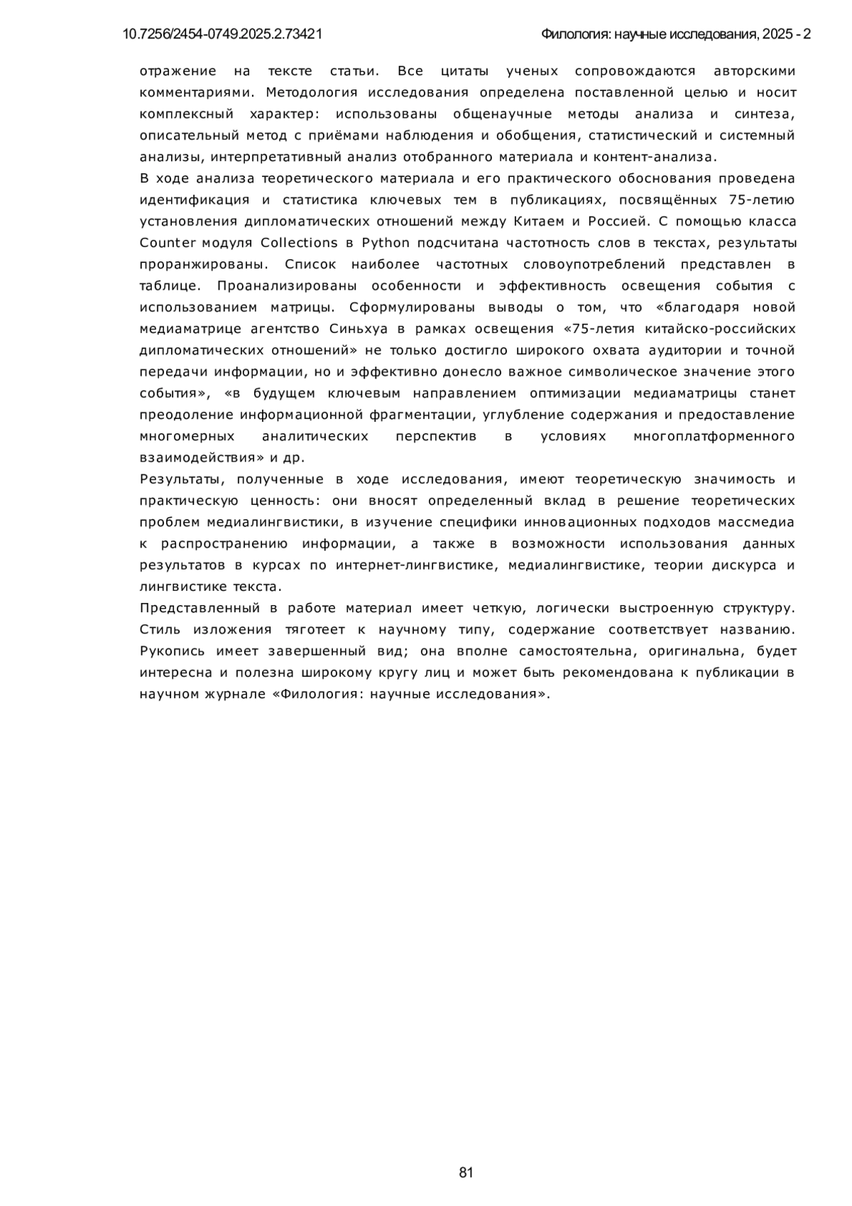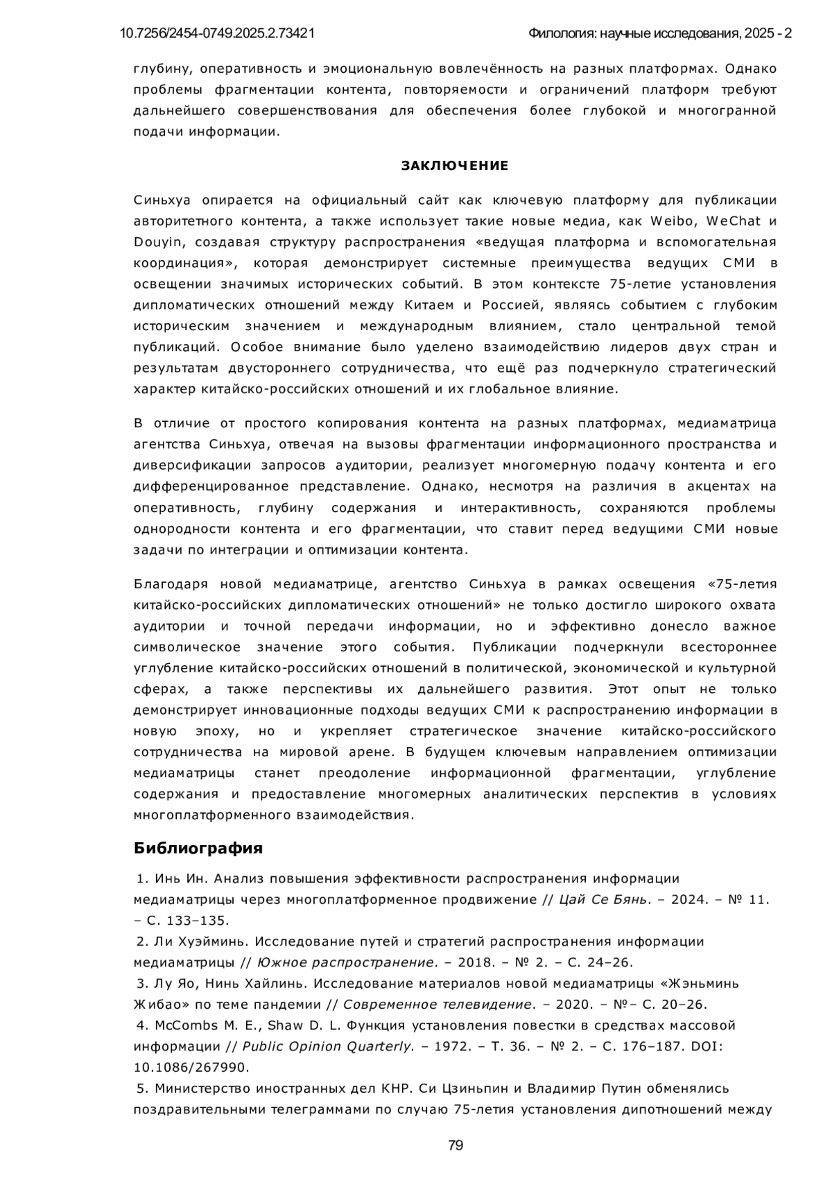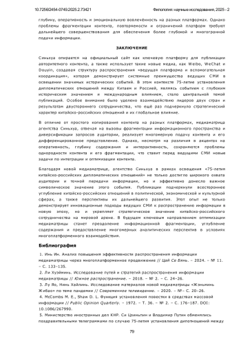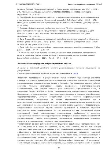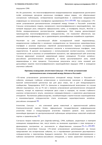 В данной статье анализируется стратегия информационного распространения агентства Синьхуа в освещении 75-летия установления дипломатических отношений между Китаем и Россией. Особое внимание уделяется использованию новой медиаматрицы, включающей координированное взаимодействие официального сайта Синьхуа, а также платформ Weibo, WeChat и Douyin. Исследование рассматривает, как через многоплатформенное распространение Синьхуа формирует целенаправленный медиадискурс, обеспечивая синхронность подачи информации и адаптацию контента под разные сегменты аудитории. В центре внимания находятся ключевые тематические акценты публикаций, включая взаимодействие лидеров двух стран, стратегическое сотрудничество и его влияние на международную арену. Работа направлена на выявление эффективности медиаматрицы Синьхуа и потенциальных проблем её реализации, таких как фрагментация контента, однообразие тематики и недостаточная интеграция между платформами. В исследовании применяется контент-анализ, включая частотный анализ слов и анализ совместного употребления, для изучения особенностей функционирования медиаматрицы Синьхуа. Эмпирическая база включает публикации с официального сайта агентства и его аккаунтов в Douyin, WeChat и Weibo за период январь-ноябрь 2024 года. Научная новизна исследования заключается в комплексном анализе новой медиаматрицы Синьхуа и её роли в освещении 75-летия установления дипломатических отношений между Китаем и Россией. Исследование демонстрирует, что медиаматрица способствует расширению охвата аудитории, обеспечивая синхронное распространение информации и адаптацию контента под особенности различных цифровых платформ. Частотный анализ показал, что в публикациях доминируют темы «сотрудничество», «развитие» и «стратегия», а анализ совместного употребления выявил, что ключевыми акцентами стали взаимодействие лидеров стран и их вклад в формирование двусторонней повестки. Результаты показывают, что медиаматрица Синьхуа эффективно противостоит раздробленности информационного пространства, однако требует улучшения механизмов взаимодействия платформ и интеграции контента. Для дальнейшего повышения глубины освещения необходимо внедрение многомерного аналитического подхода, что позволит создать более целостную информационную стратегию в рамках многоплатформенного медиапространства. Настоящее исследование не только расширяет теоретическое осмысление медиаматриц, но и предлагает практические рекомендации для ведущих СМИ в цифровую эпоху.